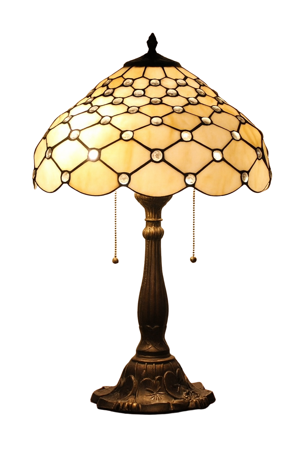Kenmerken zijn onder meer: glazen schijven of stukjes glas (vaak in organische vormen zoals bloemen of libellen), de zogenaamde “copper foil” techniek (glasstukjes omlijst met koperen folie / loodlijntjes) en vaak een bronzen of zware, decoratieve voet.
