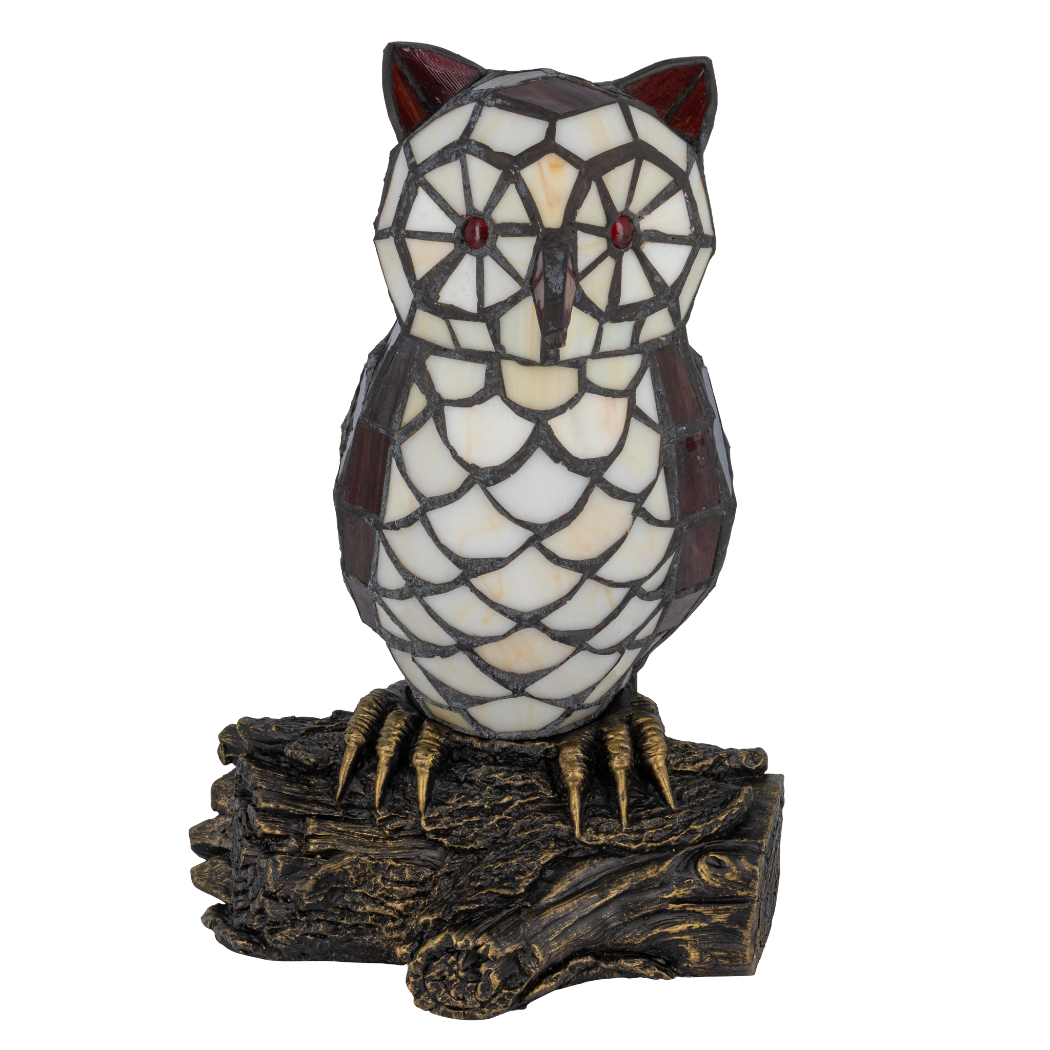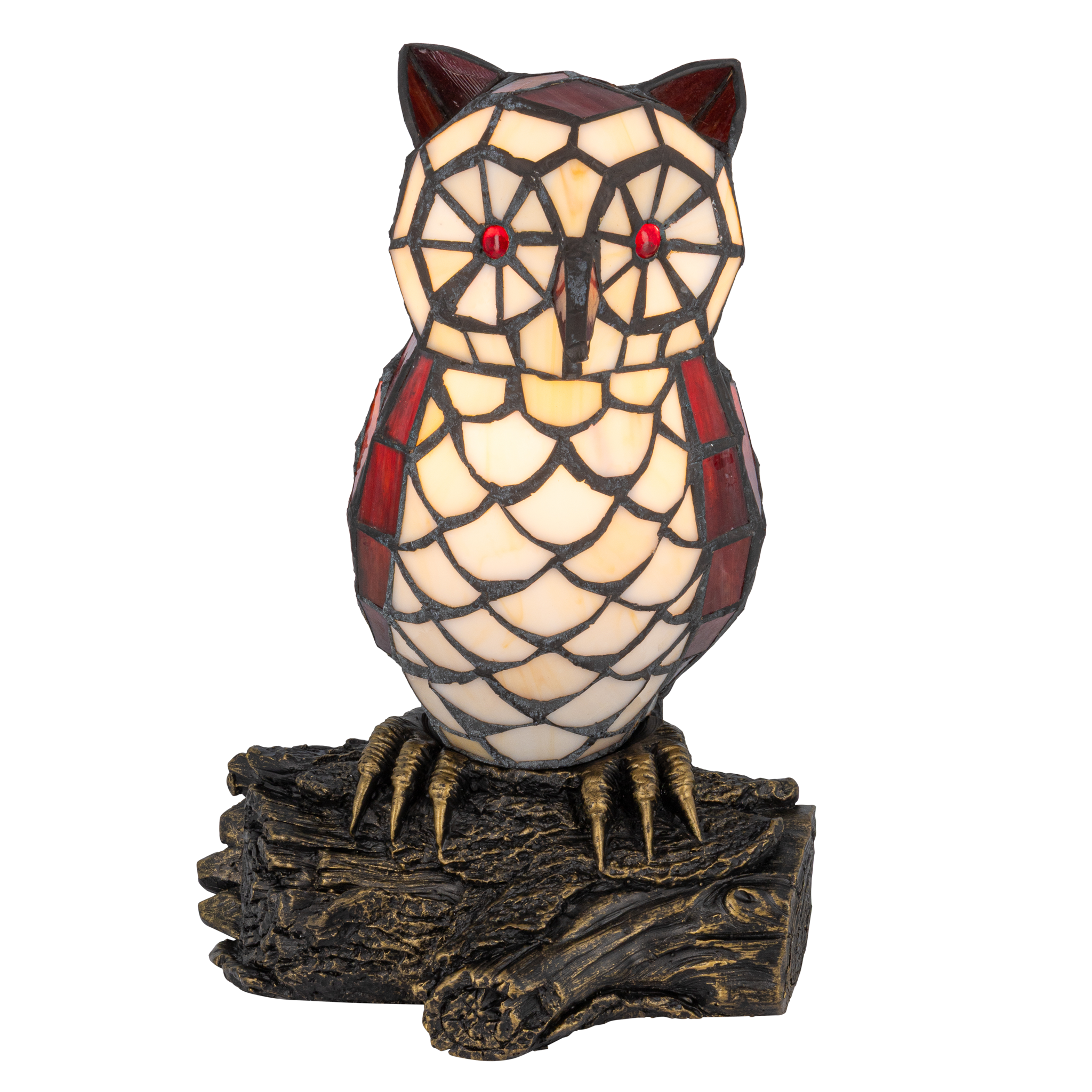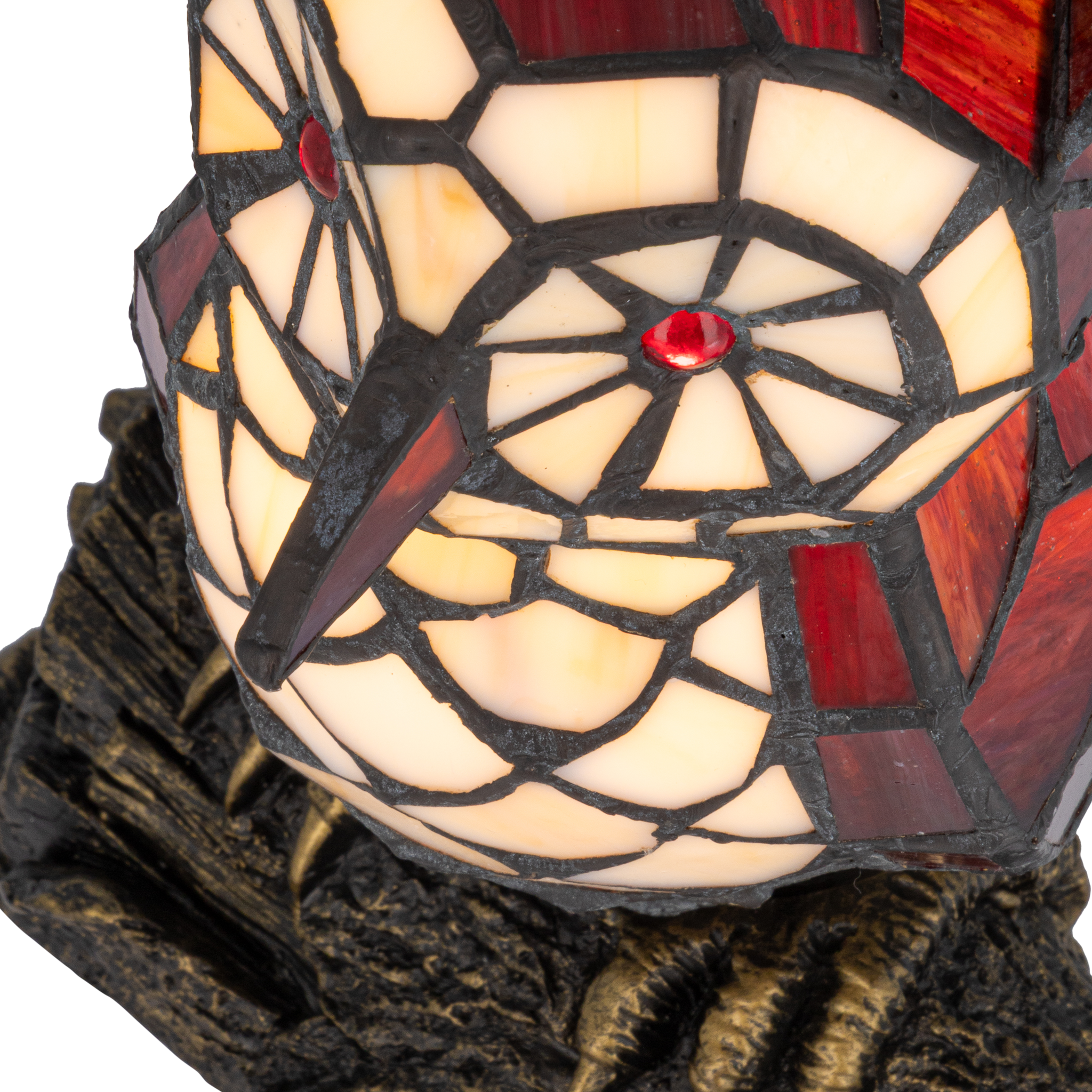 Deze Tiffany uillamp wordt opgebouwd uit ca. 178 glasstukjes die stuk voor stuk met de hand worden gesneden en gesoldeerd. De combinatie van crème- en roodtinten is geïnspireerd op klassieke Tiffany-dierenfiguren uit de Art Nouveau-periode. De voet in de vorm van een tak symboliseert natuur en bescherming.