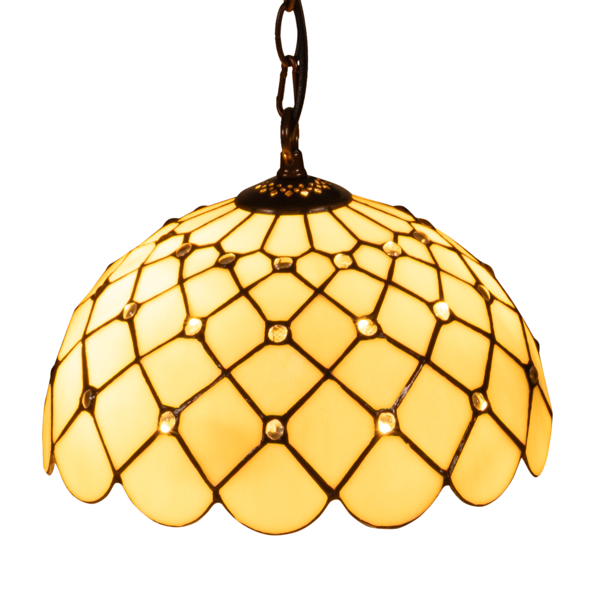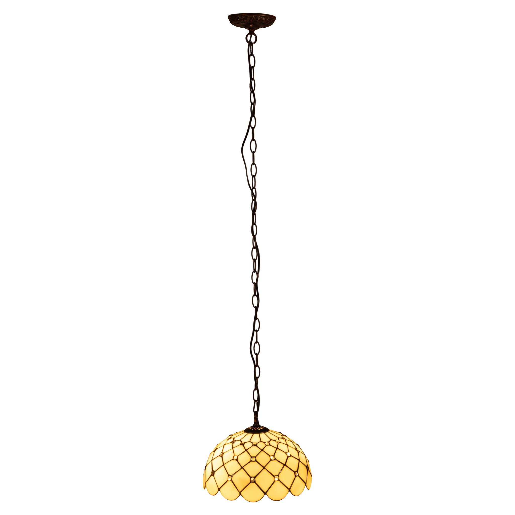 Deze Tiffany hanglamp heeft een verfijnde Tiffany kap met een klassiek patroon dat is opgebouwd uit zorgvuldig gesneden stukjes echt glas. Het ontwerp zorgt voor een warm en sfeervol lichtbeeld, waarbij het licht gelijkmatig door de kap wordt verspreid. Door de subtiele vormgeving en rustige uitstraling past deze hanglamp moeiteloos in verschillende ruimtes, zoals de woonkamer, eetkamer, hal of boven een tafel of zithoek.
