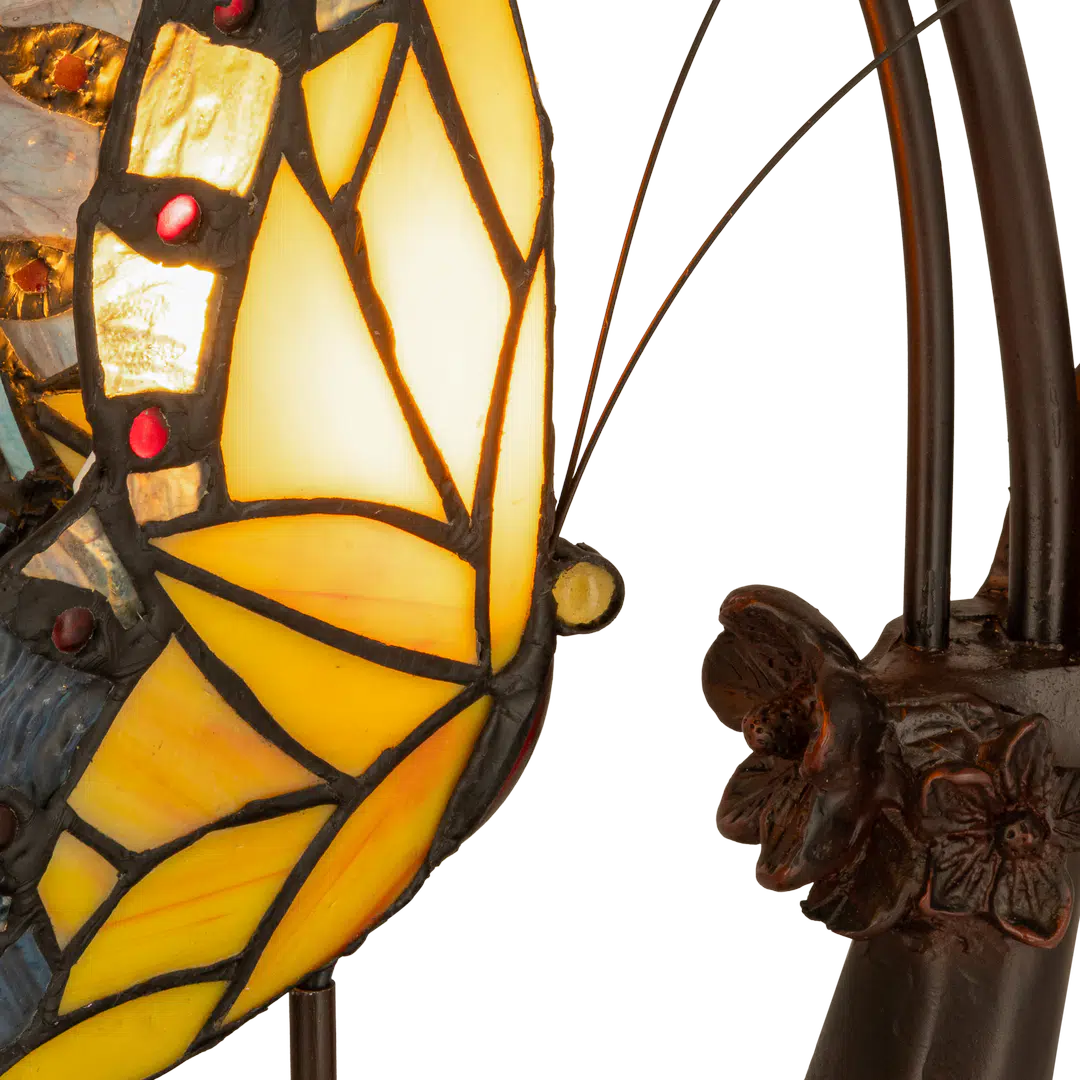 Deze Tiffany lamp (Art. 7054) bestaat uit ca. 152 handgesneden glasdelen in warme gele, blauwe en grijsgroene tinten. De dubbele vlindervorm is geïnspireerd op Art Nouveau-stijlen waarin natuur en organische lijnen centraal stonden. De glasvleugels worden in koperfolie gezet en met de hand gesoldeerd, waardoor elke lamp uniek is — een lichtobject met karakter en ambacht.