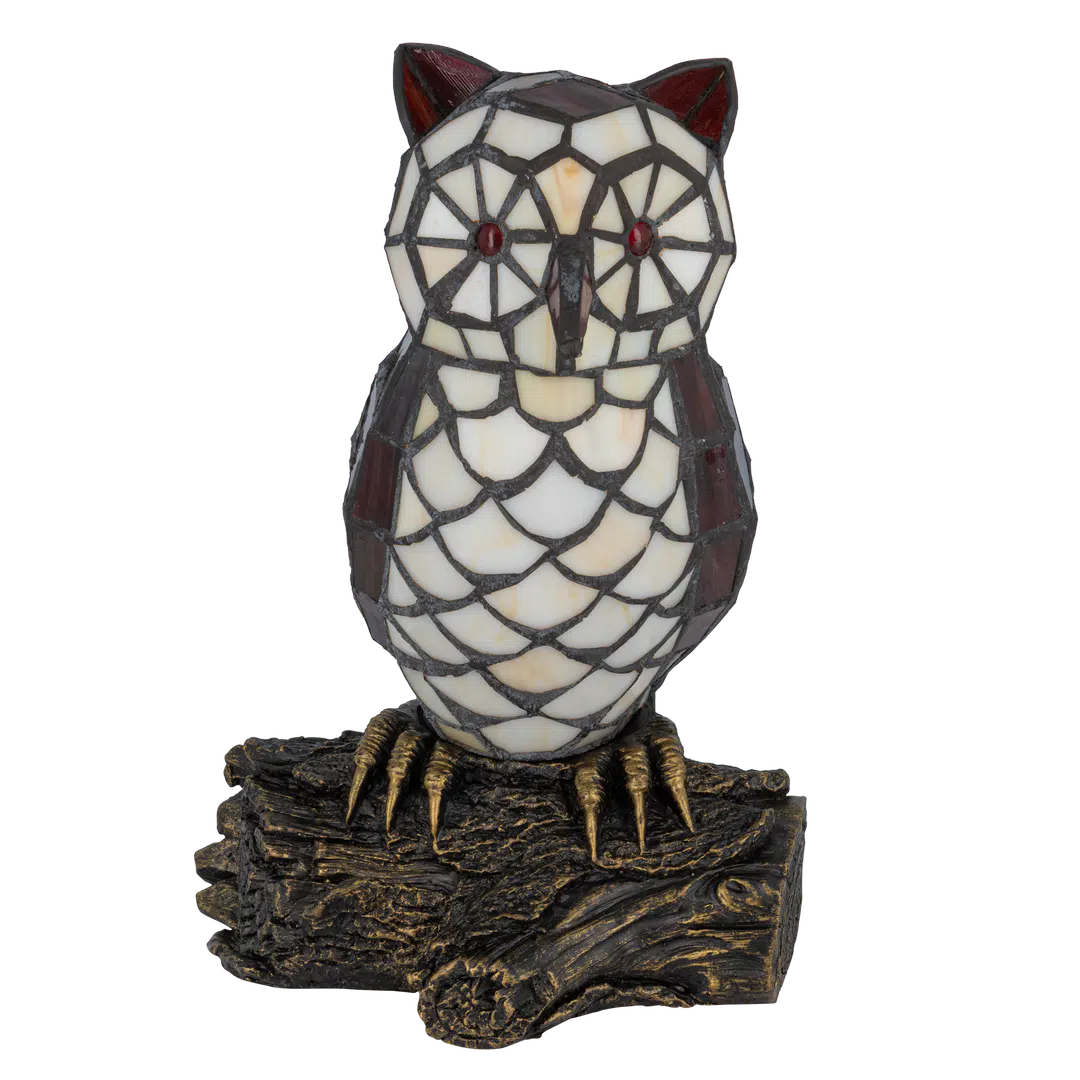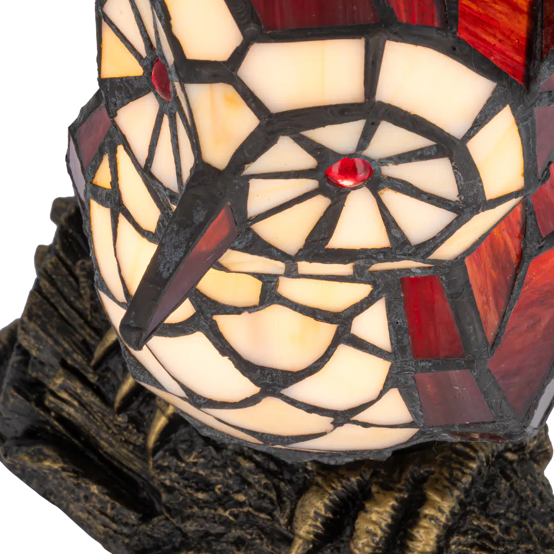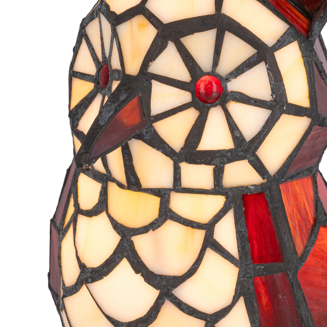 Deze Tiffany uillamp wordt opgebouwd uit ca. 178 glasstukjes die stuk voor stuk met de hand worden gesneden en gesoldeerd. De combinatie van crème- en roodtinten is geïnspireerd op klassieke Tiffany-dierenfiguren uit de Art Nouveau-periode. De voet in de vorm van een tak symboliseert natuur en bescherming.