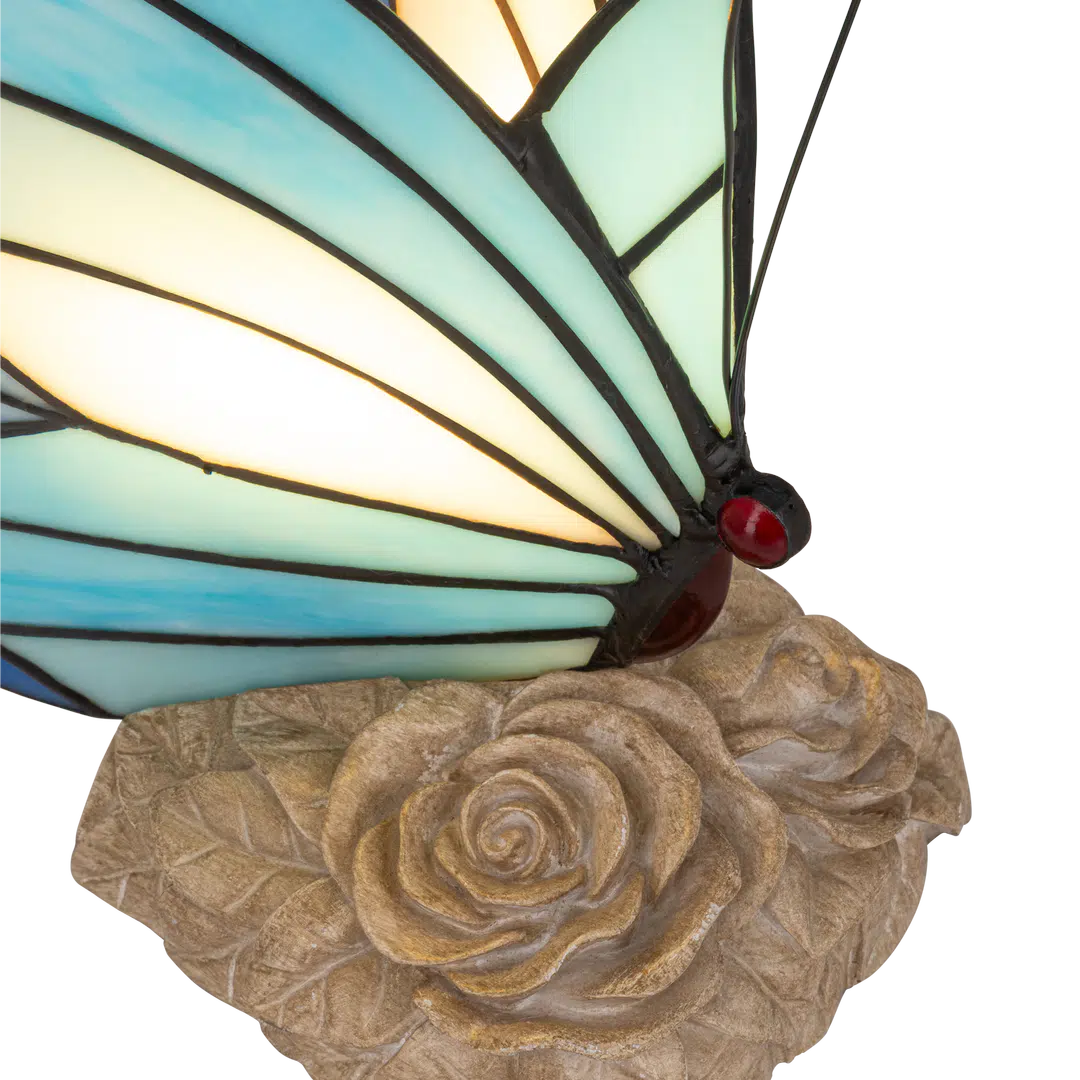 De vlinder staat op een sierlijke voet met gedetailleerde rozenornamenten, wat het geheel een romantische, natuurlijke en verfijnde uitstraling geeft.