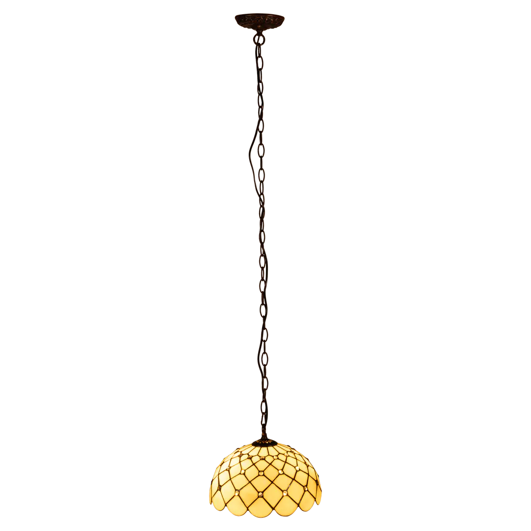 De Tiffany hanglamp heeft een verfijnde kap, opgebouwd uit zorgvuldig gesneden stukjes echt glas die samen een klassiek patroon vormen. Het ontwerp straalt elegantie uit en zorgt voor een warm en sfeervol lichtbeeld. Het licht wordt gelijkmatig door de kap verspreid, waardoor de lamp perfect is voor het creëren van een gezellige sfeer in verschillende ruimtes. De bolvormige Tiffany kap geeft de lamp een tijdloze uitstraling die zowel in klassieke als sfeervolle interieurs prachtig tot zijn recht komt.