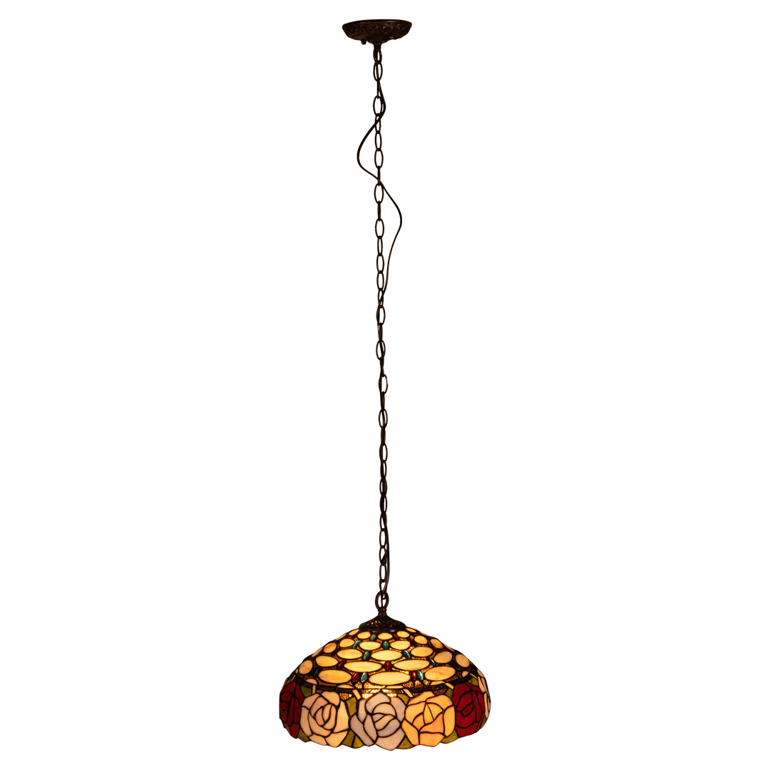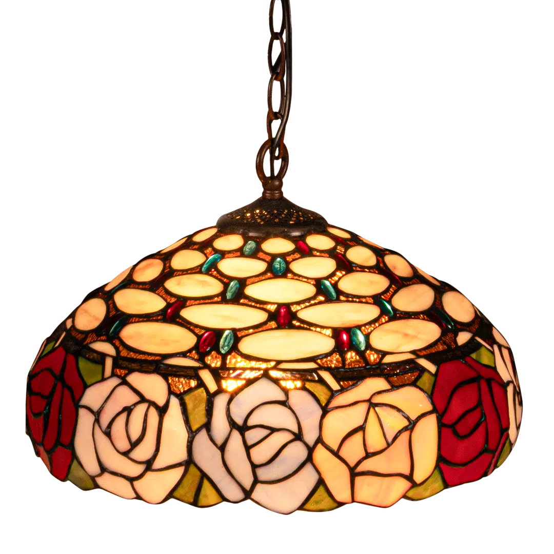 De Tiffany hanglamp is rijk gedecoreerd met een verfijnd rozenmotief rondom, wat zorgt voor een elegante uitstraling. De kap bestaat uit circa 420 stukjes echt glas, die samen een warm en sfeervol lichtbeeld creëren. De combinatie van zachte basiskleuren en contrasterende accenten geeft het licht een levendige, maar toch elegante uitstraling. Deze lamp is ideaal voor ruimtes waar sfeer en karakter samenkomen, en past perfect in zowel klassieke als eigentijdse interieurs.