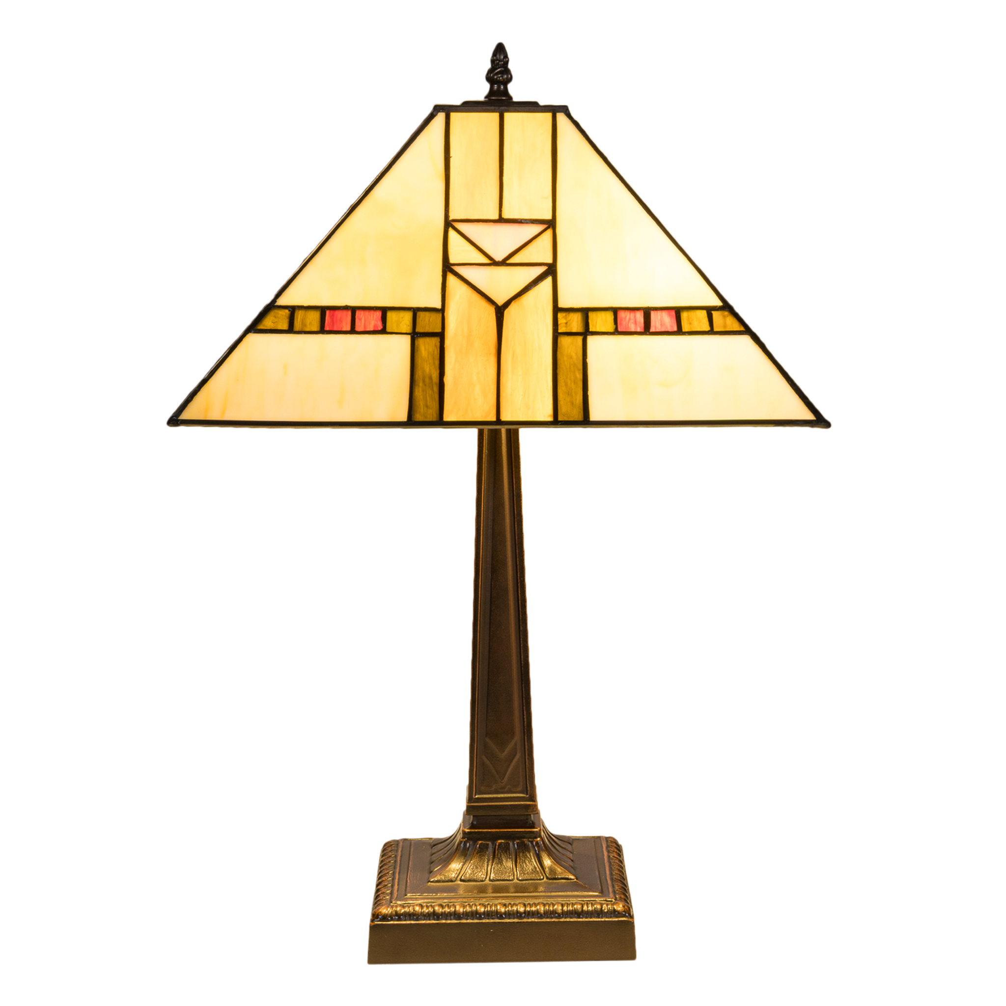 Breng stijl, rust en karakter in huis met deze elegante Tiffany tafellamp geïnspireerd op zowel de Art Deco-periode als de Mission-stijl. De kap is opgebouwd uit ca. 104 zorgvuldig handgesneden glasdelen, samengebracht tot een strak en harmonieus geometrisch ontwerp. De warme crème- en amberkleuren worden subtiel aangevuld met diepe rode en olijfgroene accenten, waardoor het geheel een rijke, architectonische uitstraling krijgt.