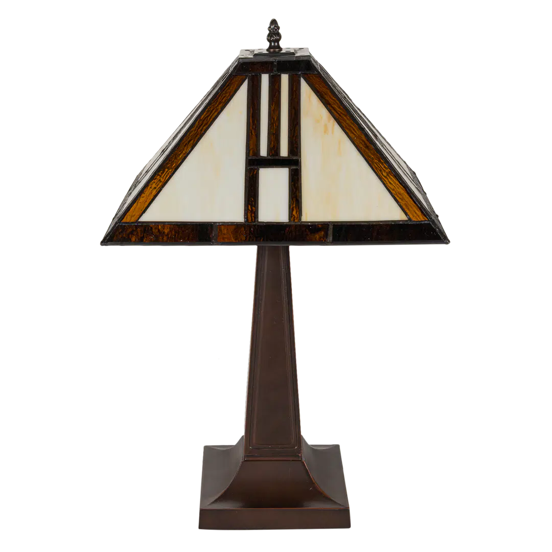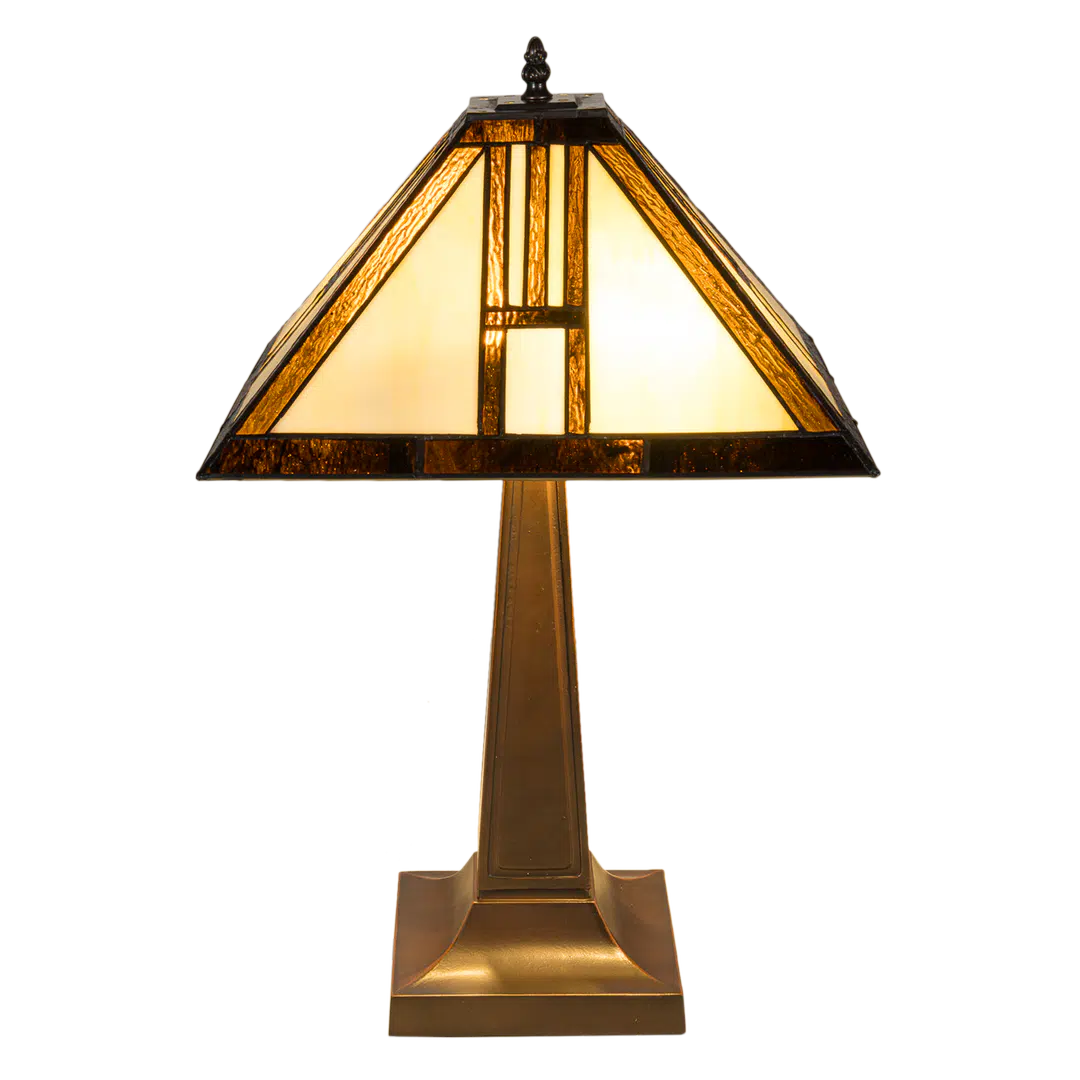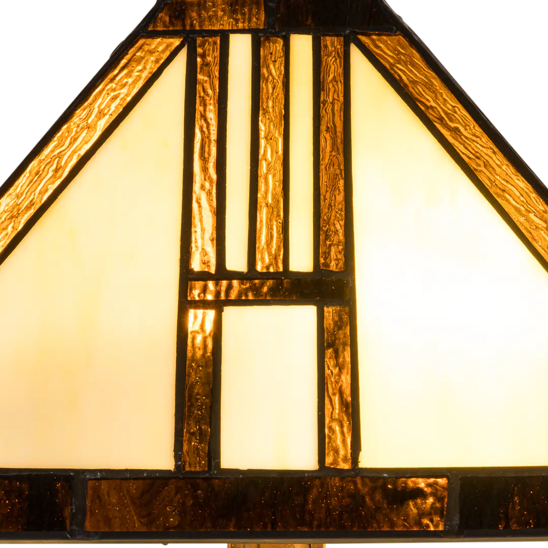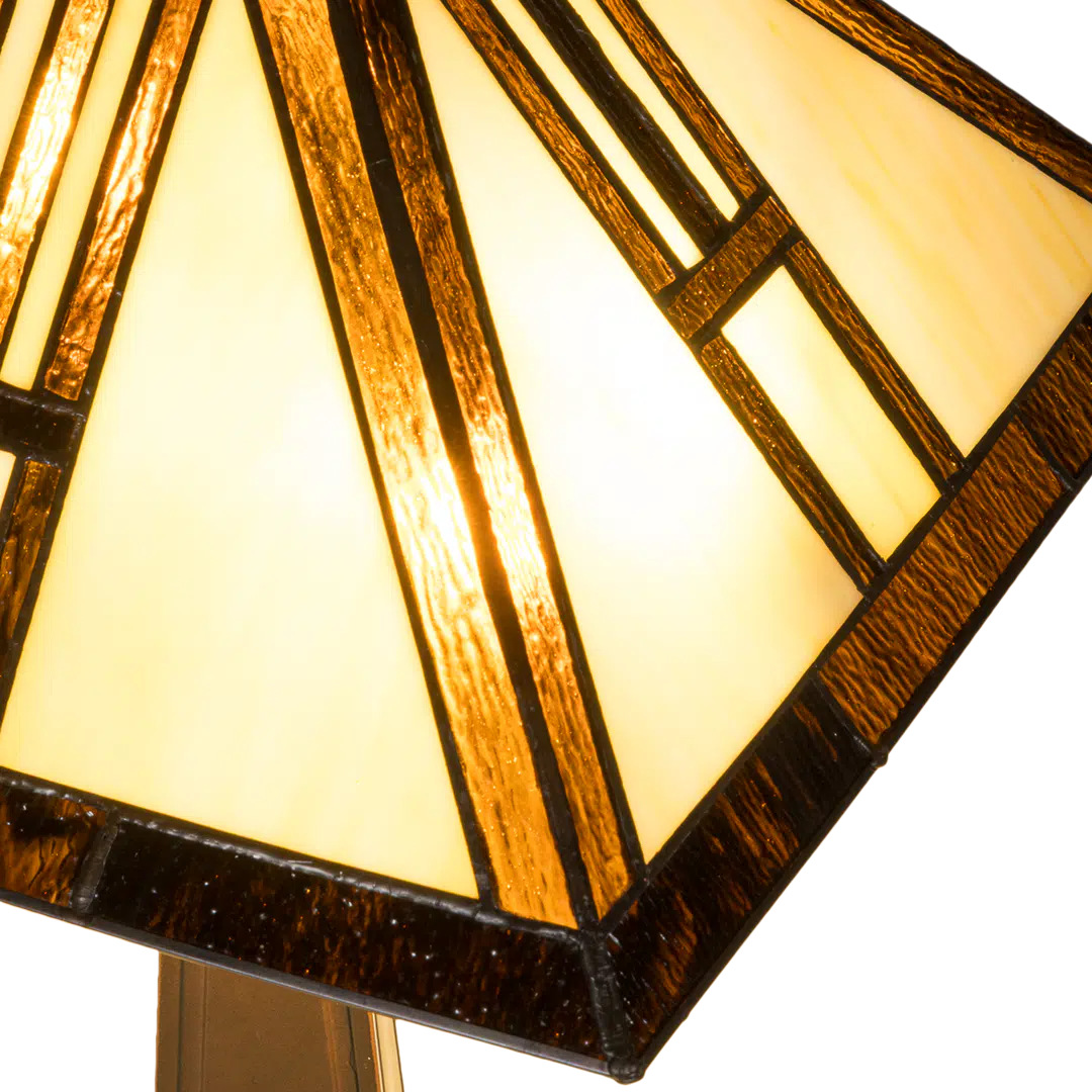 Breng rust, balans en klassieke Arts & Crafts-uitstraling in huis met deze strak vormgegeven Tiffany tafellamp. De kap is volledig met de hand opgebouwd uit ca. 72 zorgvuldig gesneden glasdelen, geordend in een helder geometrisch lijnenspel van verticale en diagonale stroken. De warme crème- en amberaccenten geven het ontwerp een ingetogen, tijdloze elegantie die perfect past in zowel moderne als traditionele interieurs.
