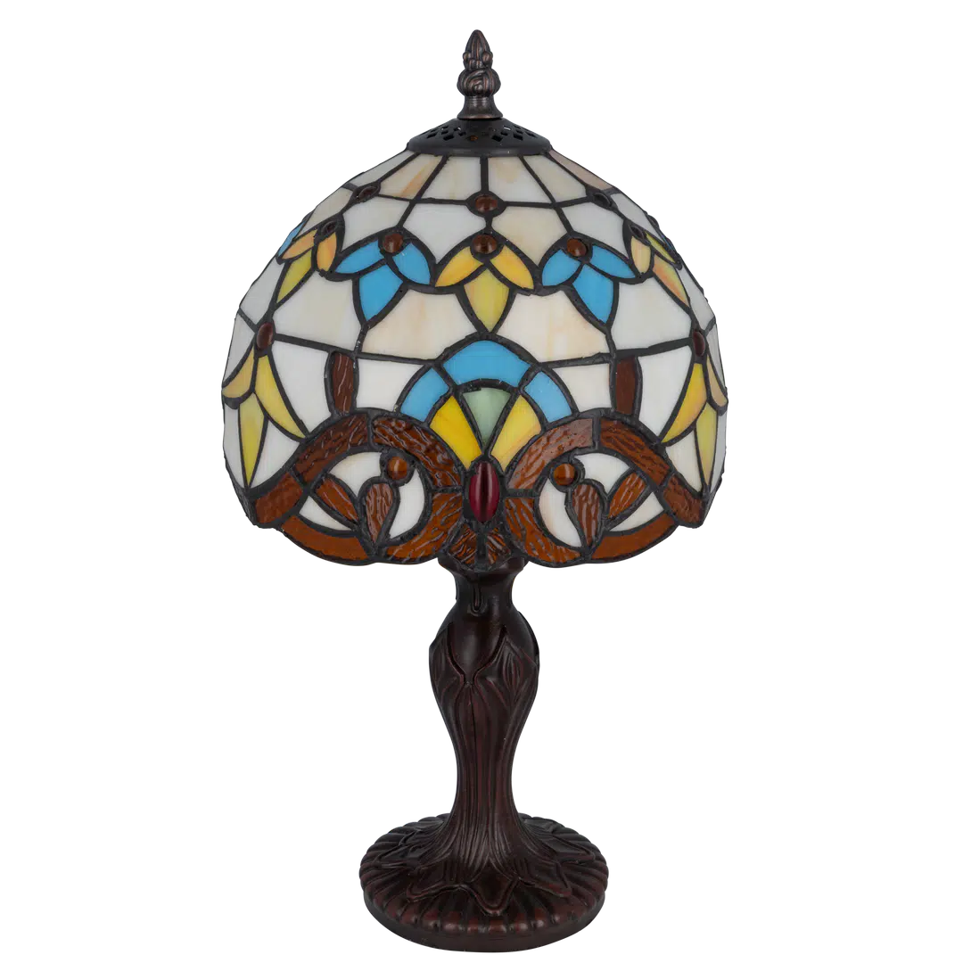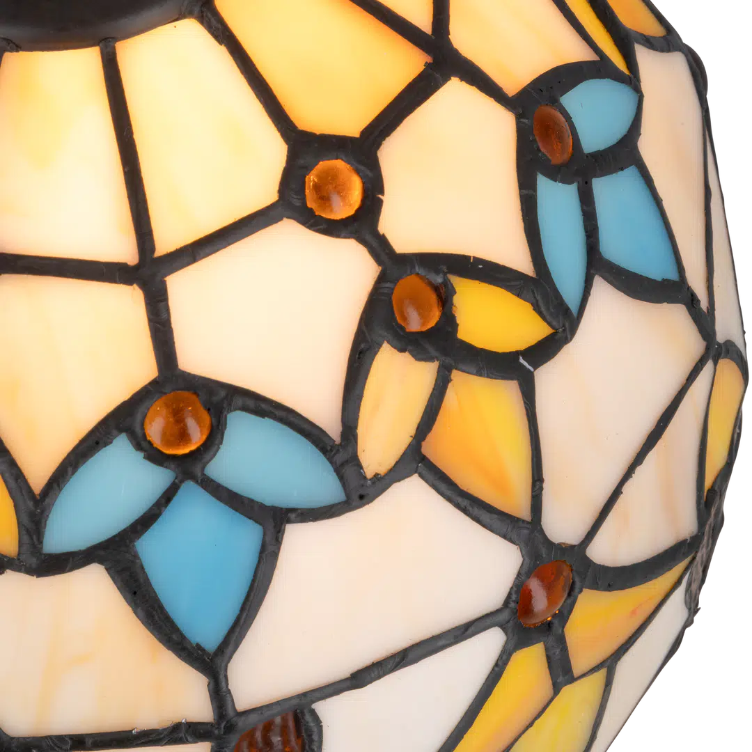 De Tiffany tafellamp is opgebouwd uit circa 214 handgesneden stukjes glas, samengevoegd met de traditionele koperfolie-techniek. Het decoratieve patroon van crèmekleurige vlakken, gele en blauwe accenten, en amberkleurige glassteentjes zorgt voor een levendig effect dat zowel elegant als expressief is.
