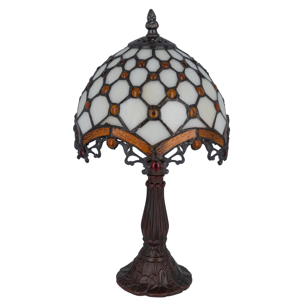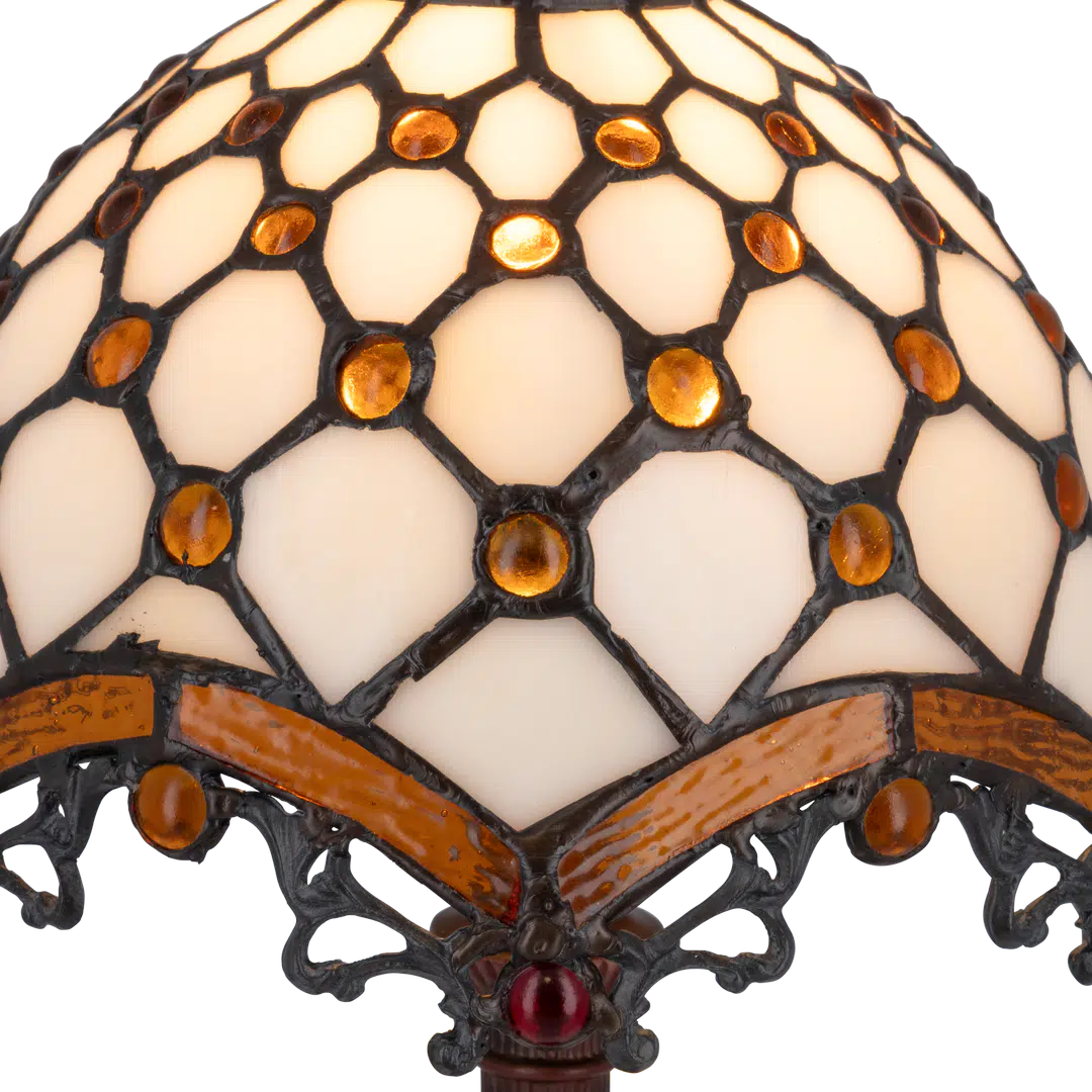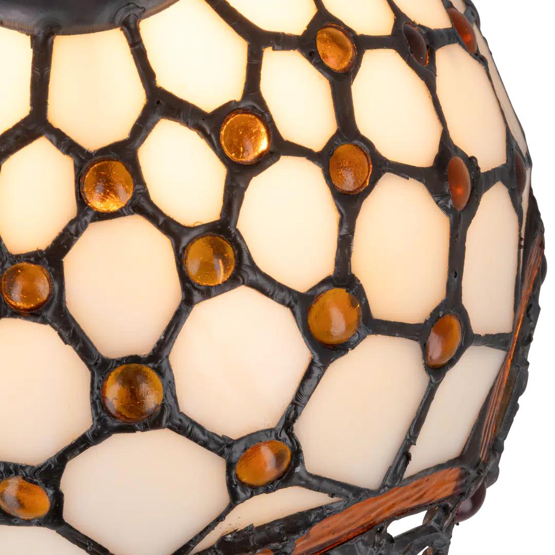 Deze Tiffany tafellamp heeft een rustige, klassieke uitstraling waarin ambacht en verfijning samenkomen. De afgeronde Tiffany kap is opgebouwd uit ca. 135 stukjes echt glas, die samen een zacht en evenwichtig patroon vormen. Het merendeel van het glas is uitgevoerd in een warme crèmekleur, afgewisseld met kleine amberkleurige accenten die als subtiele lichtpunten door het geheel zijn verspreid. Wanneer de lamp brandt, ontstaat een warm en gelijkmatig licht dat de structuur van het glas mooi tot leven brengt.