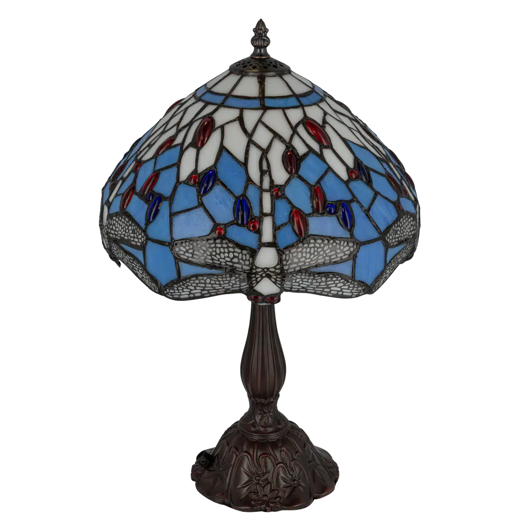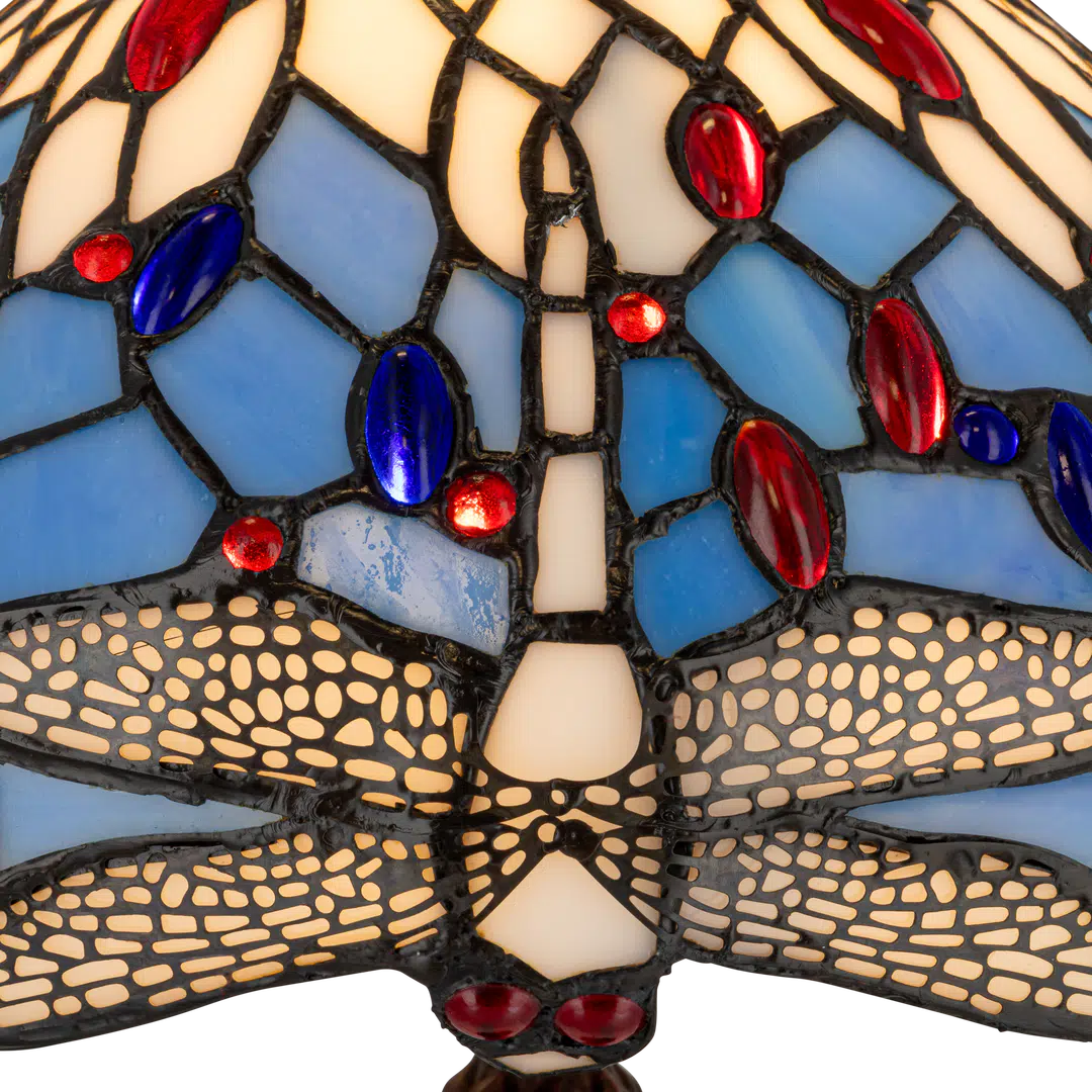 Deze Tiffany tafellamp is rijk uitgevoerd met een verfijnd libelle (dragonfly)-motief dat direct herkenbaar is in de kap. De libelle vormt het centrale ontwerp, met uitgespreide vleugels die zich elegant rondom de kap ontvouwen. Het patroon is opgebouwd uit een combinatie van zacht crèmeglas en koele blauwtinten, aangevuld met levendige accenten in rood en diepblauw glas. Dit samenspel van kleuren en vormen geeft de lamp een dynamische, maar toch harmonieuze uitstraling.