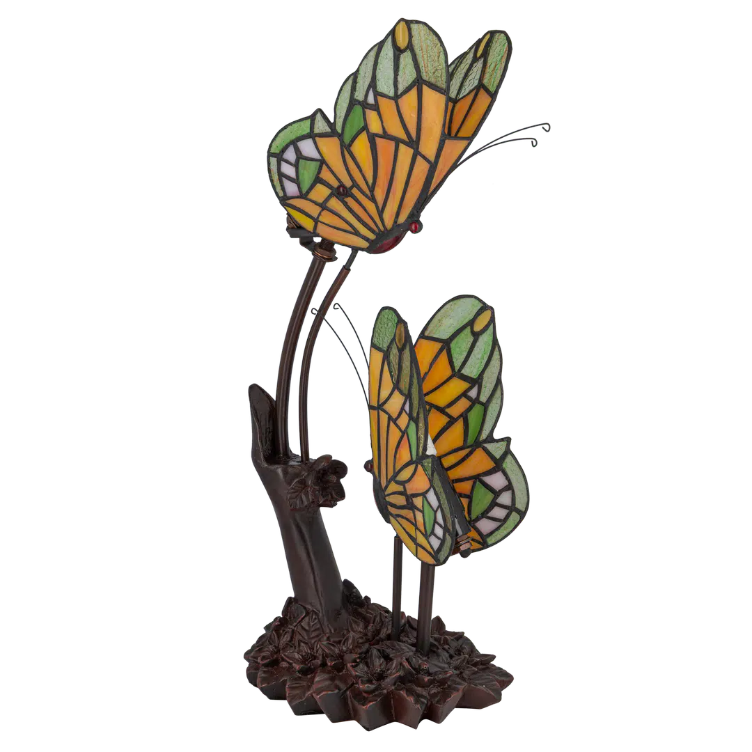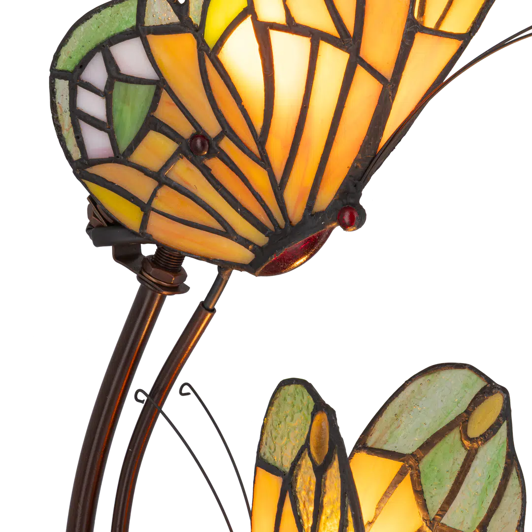 Tiffany dubbele vlinderlamp – Amber, Groen & Wit Glas – L 17 × B 23 × H 45 cm (Art. 7055)