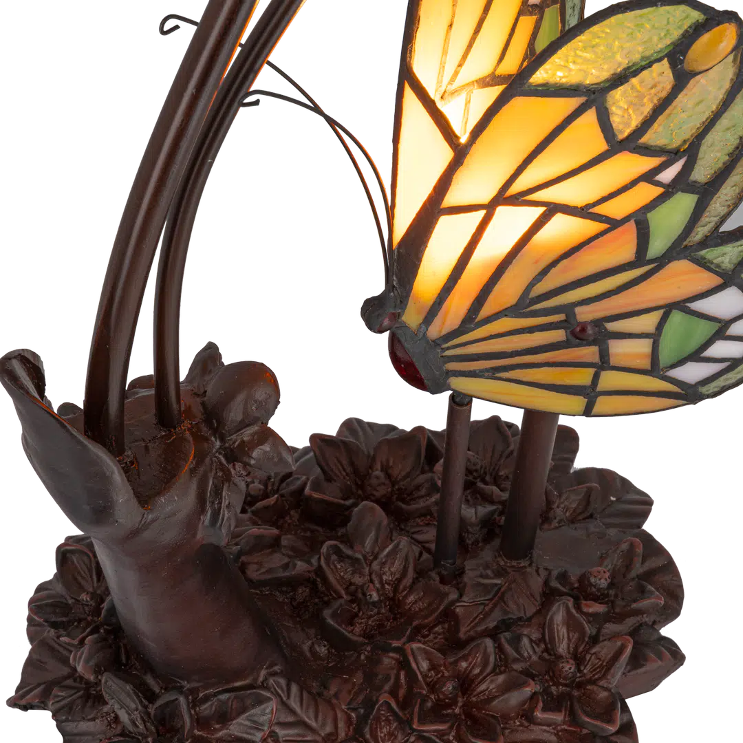 Breng poëzie, licht en verfijnde Tiffany-sfeer in huis met deze bijzondere dubbele vlinderlamp van RORUVERA. De twee vlinders lijken zo te zijn neergestreken op een sierlijke tak, elk met een eigen glas-in-lood kap die warm oplicht en de rijke kleuren prachtig laat stralen. De combinatie van amber, groen en zacht wit glas zorgt voor een levendige, bijna betoverende gloed die elke ruimte direct een warm karakter geeft.