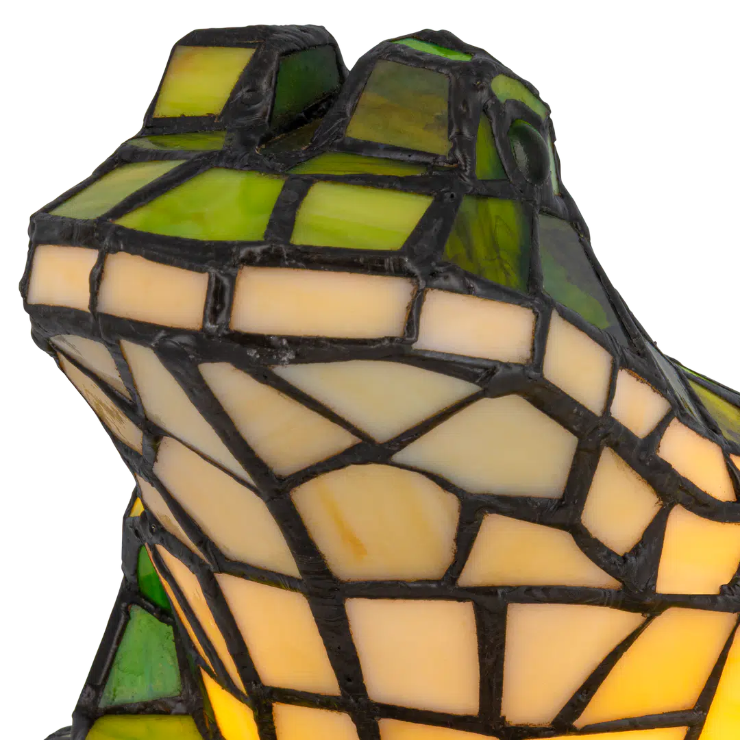 Het mozaïek van glasstukjes geeft de kikker zijn kenmerkende Tiffany-uitstraling: tijdloos, warm en rijk aan detail.
