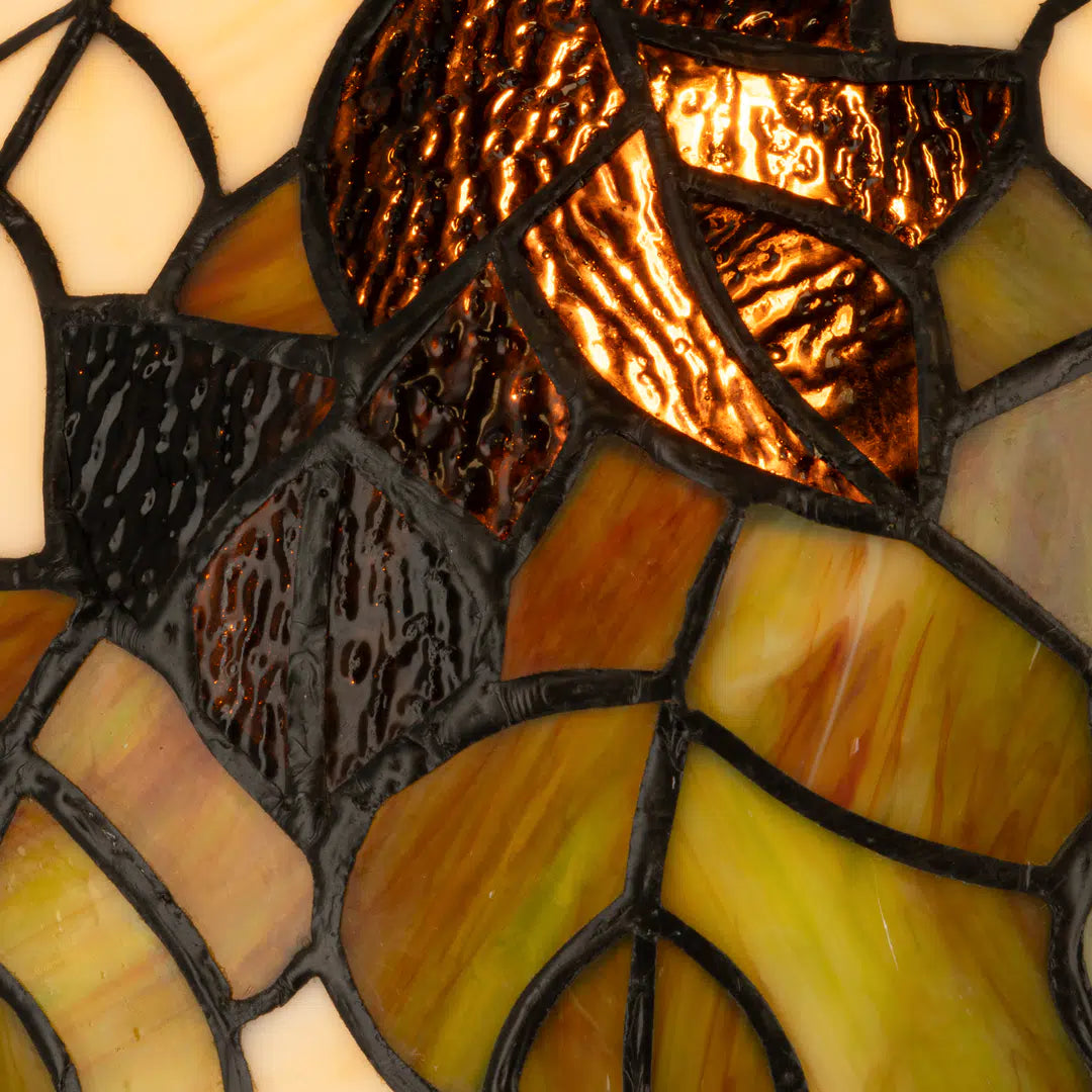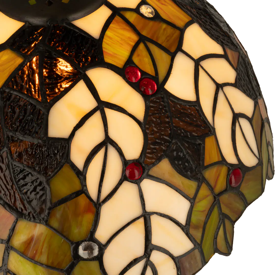 Deze lamp bestaat uit ca. 234 handgesneden glasdelen in groen-, crème- en bruintinten. Het bladerpatroon is geïnspireerd op Art Nouveau en natuurmotieven uit de klassieke Tiffanystijl.