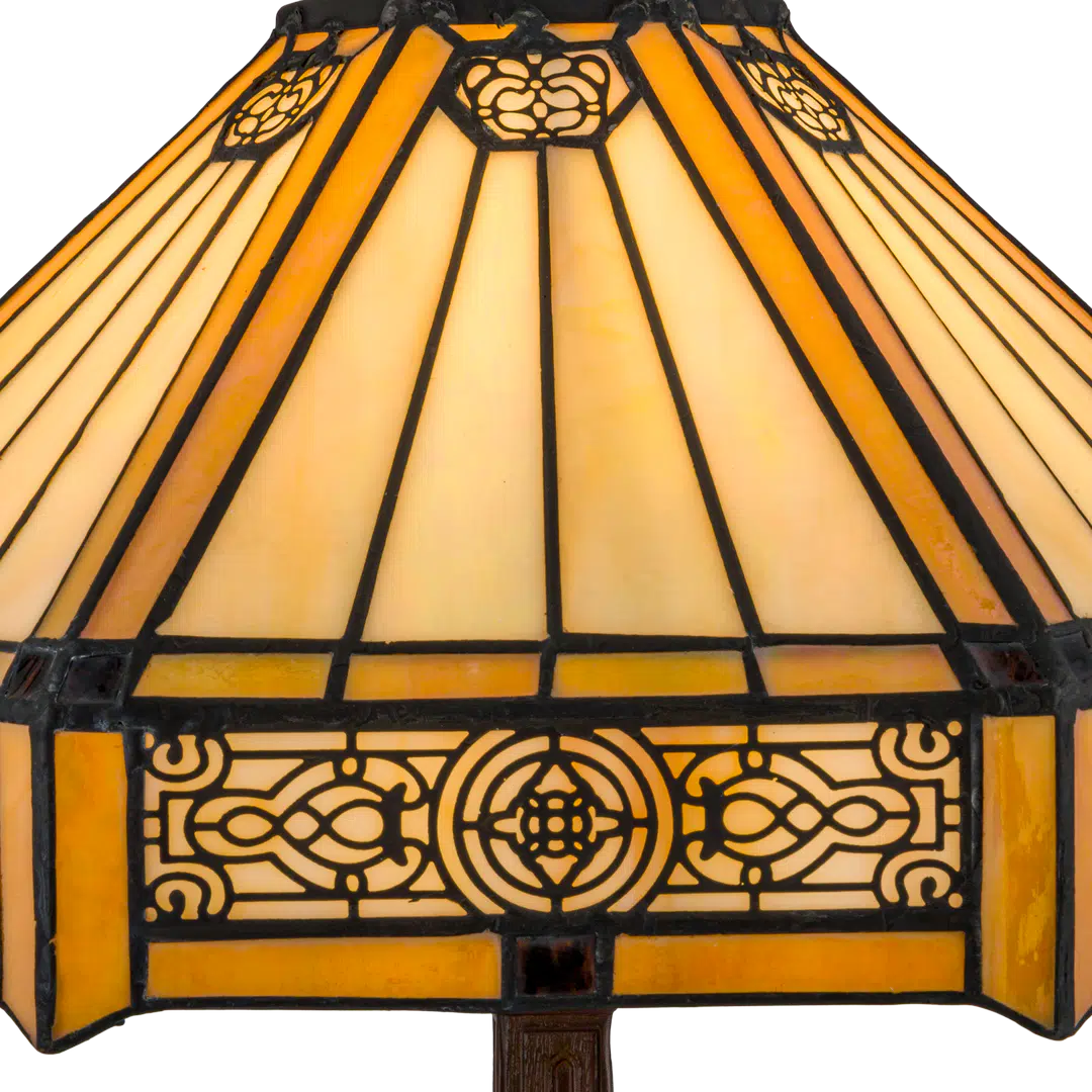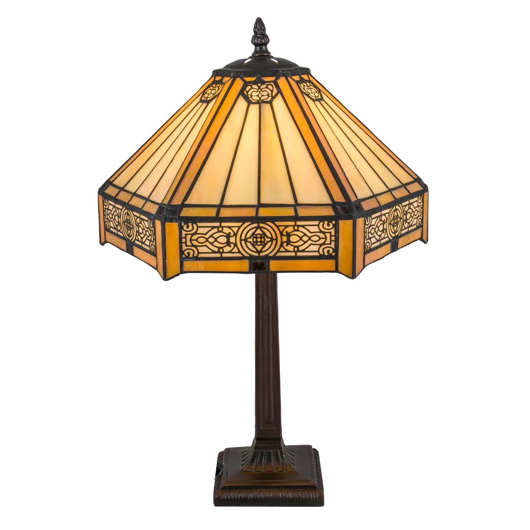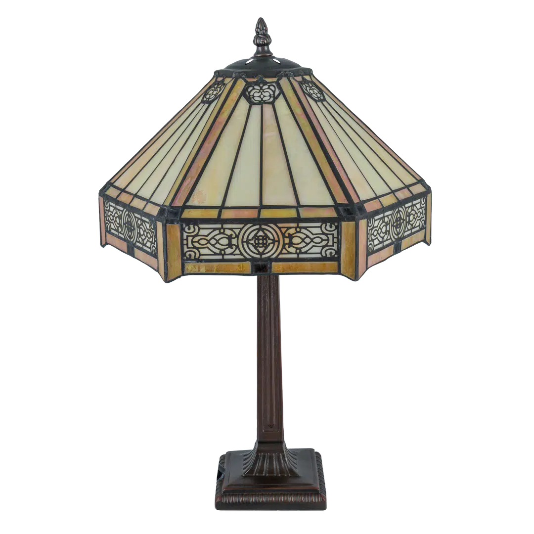 De kap van deze Tiffany tafellamp bestaat uit circa 126 handgesneden stukjes glas, samengevoegd met de traditionele koperfolie-techniek. Het geometrische patroon van lijnen en kleuren zorgt voor een verfijnd ontwerp dat de Tiffany-stijl weerspiegelt. Het vakmanschap en de combinatie van crème- en ambertinten geven de lamp een tijdloze uitstraling die moeiteloos past in zowel klassieke als moderne interieurs.