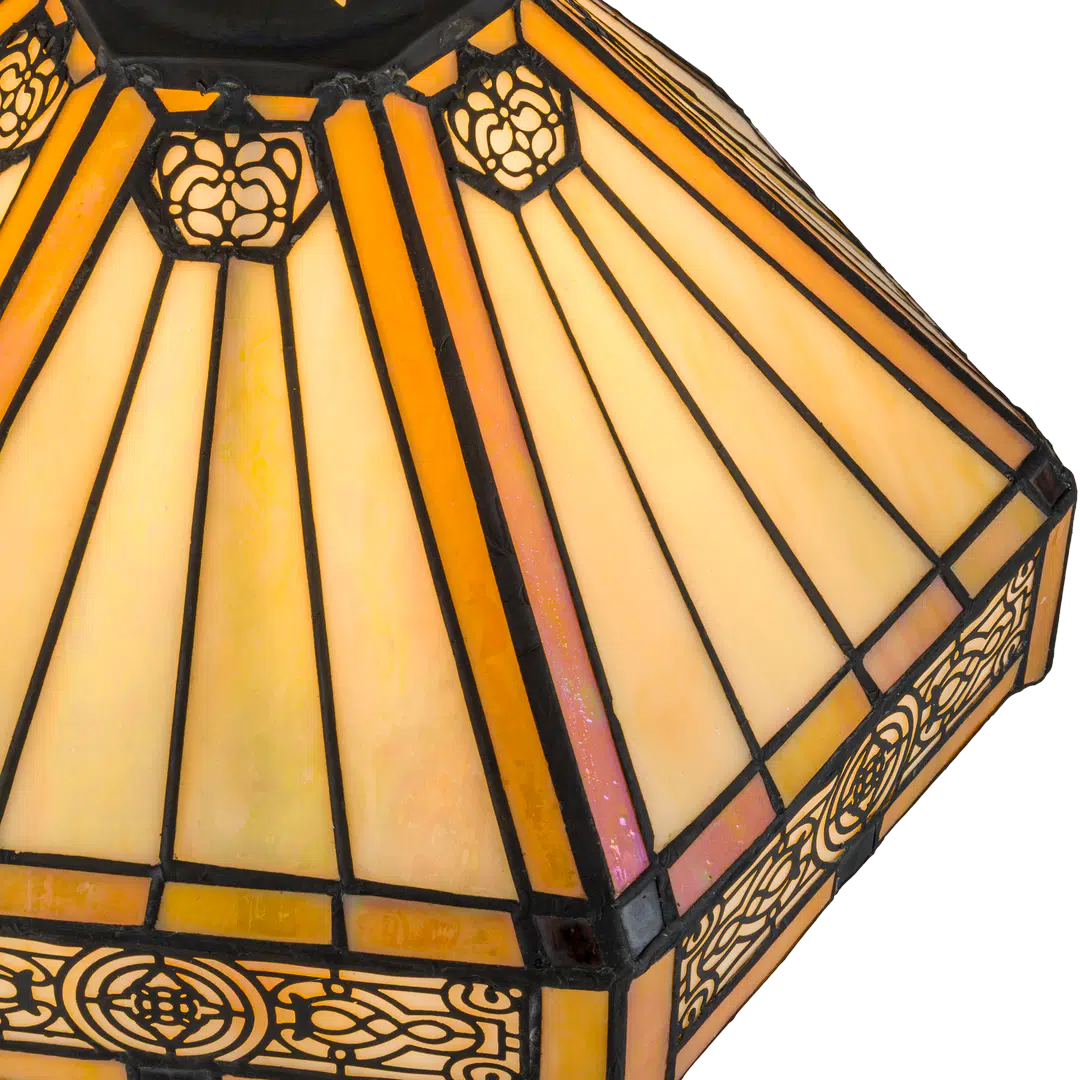 Wanneer de lamp brandt, verspreidt het licht zich gelijkmatig en ontstaat een warme gloed die het patroon rustig accentueert. Het lichte crèmekleurige glas zorgt voor een zachte verlichting, terwijl de amberkleurige accenten de lamp extra diepte en warmte geven. Door de grotere kap wordt het licht iets breder verspreid, wat zorgt voor een nog rijkere en sfeervollere lichtbeleving. Ideaal voor een gezellige leeshoek, een werkkamer of als sfeerverlichting in de woonkamer.
