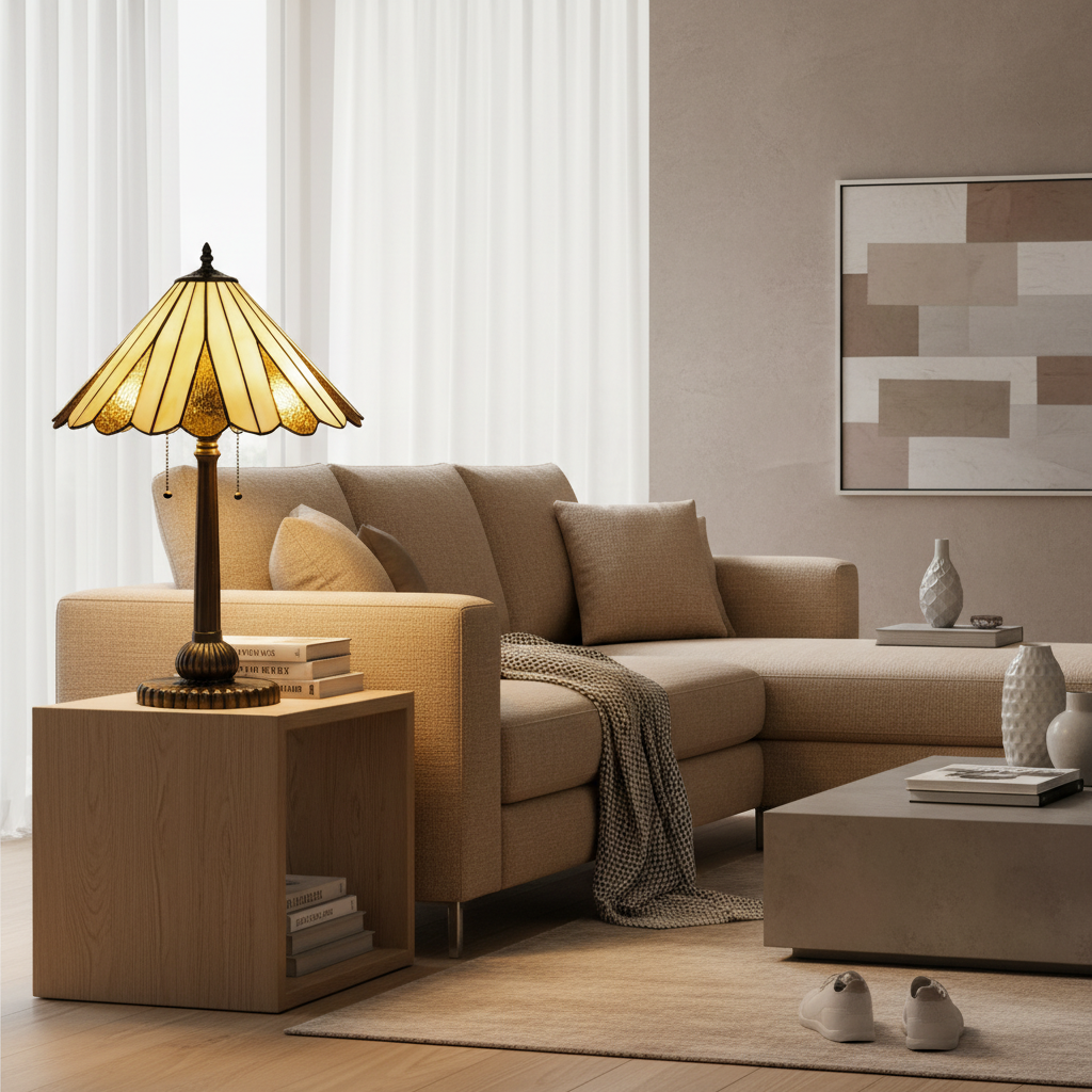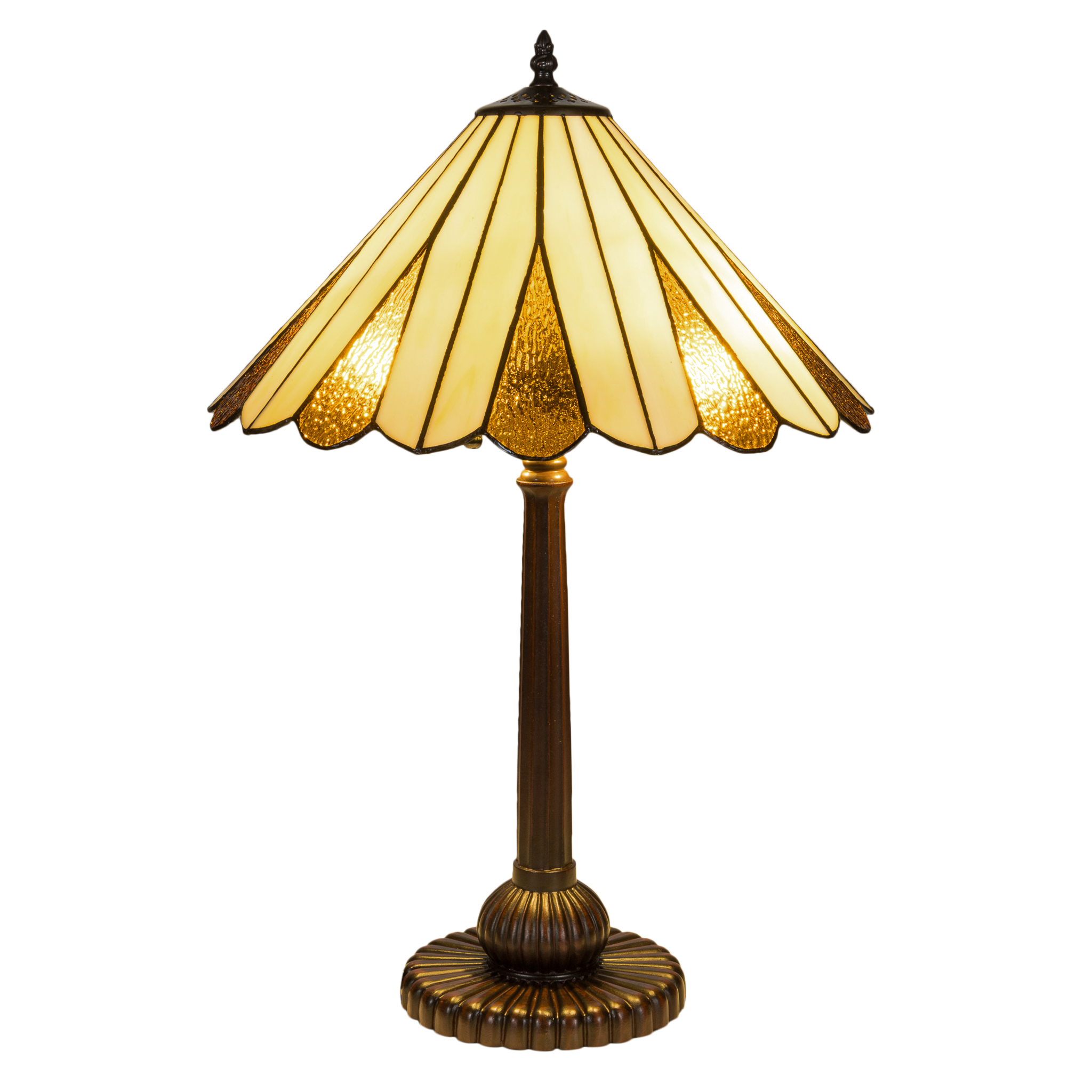 Breng tijdloze elegantie en warme Tiffany-sfeer in huis met deze klassieke glas-in-lood tafellamp van RORUVERA. De royale kap is opgebouwd uit ca. 30 handgesneden glaspanelen in crème- en amberkleuren, zorgvuldig gesoldeerd tot een ingetogen maar uiterst stijlvol geheel.