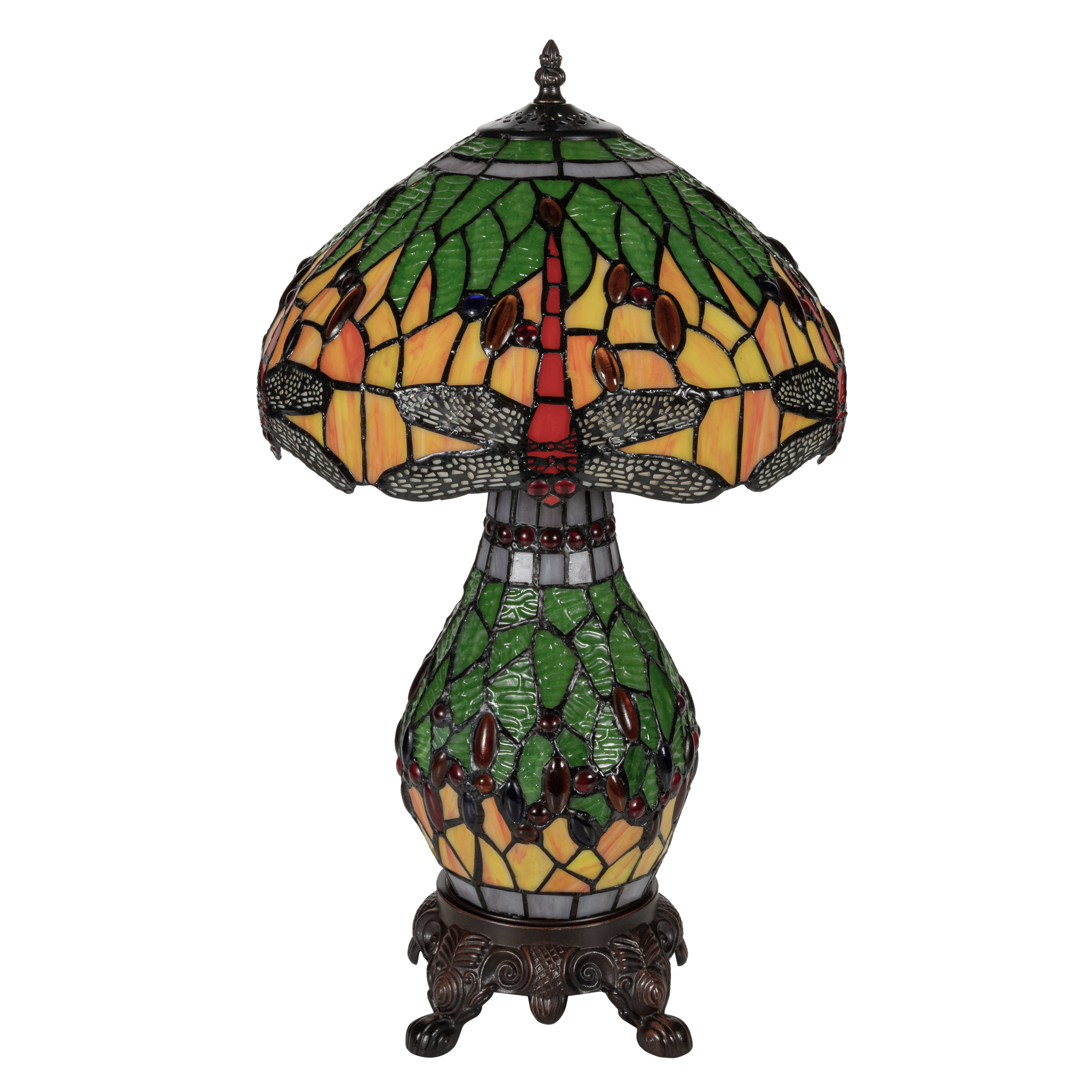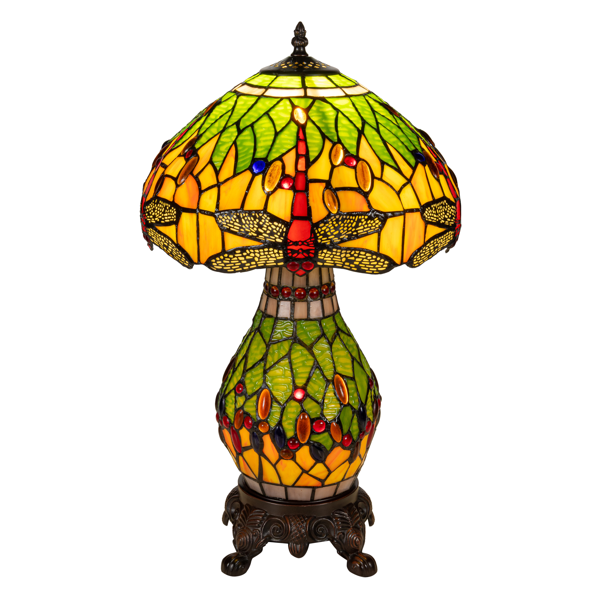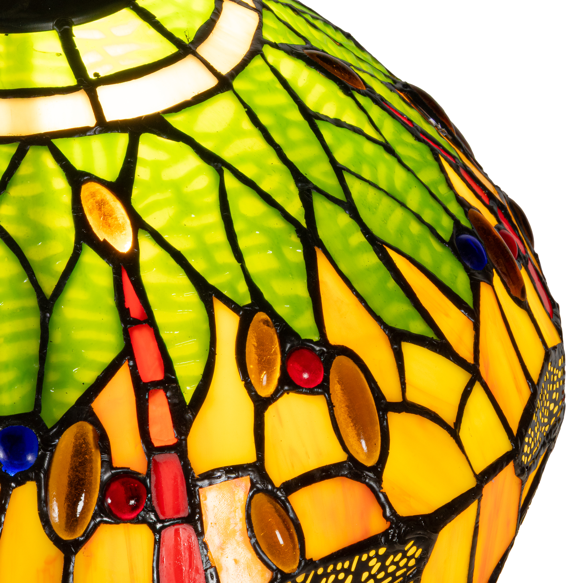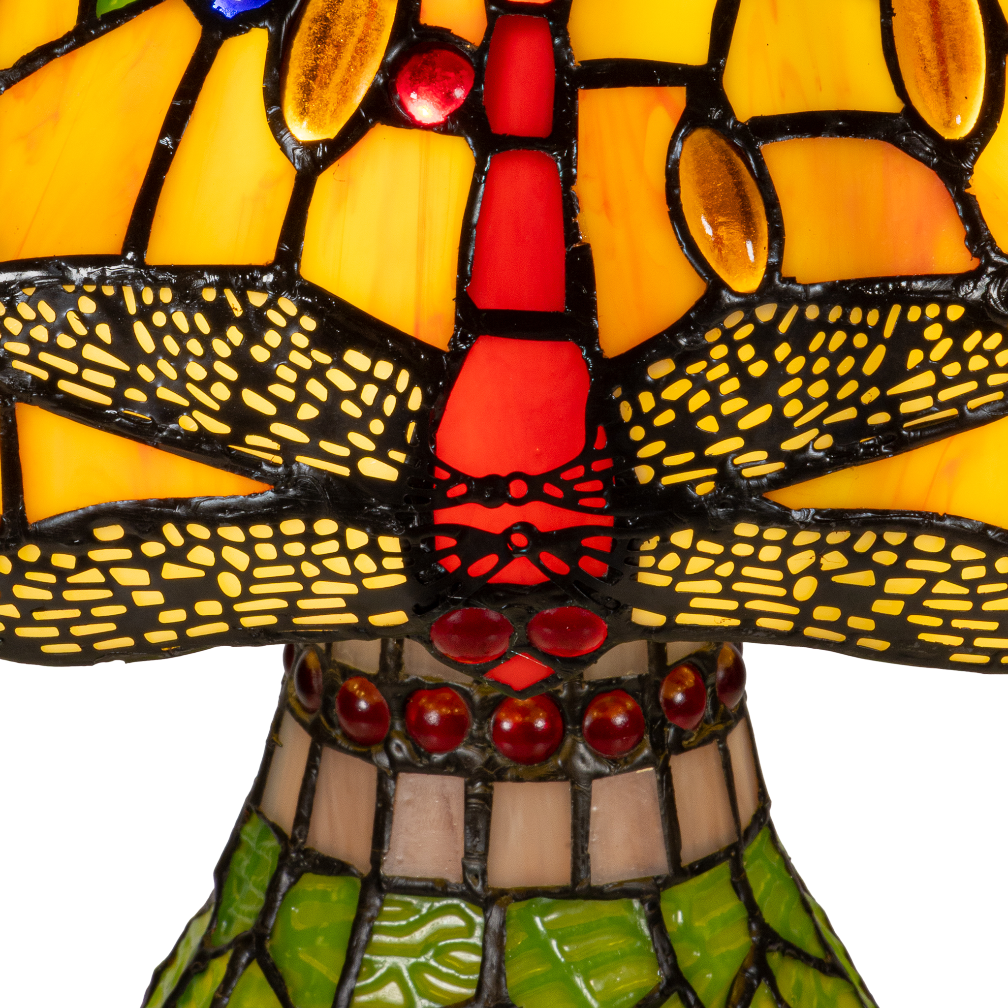 Tiffany tafellamp met verlichte voet – libelle in geel/groen/rood – Ø 30 cm × H 48 cm (Art. 7600)
