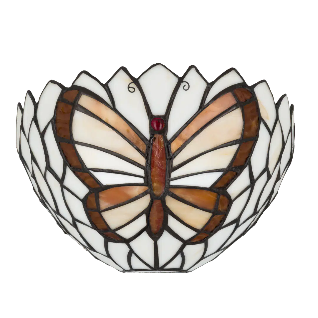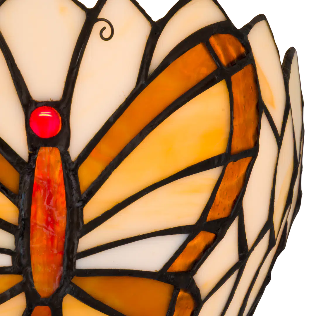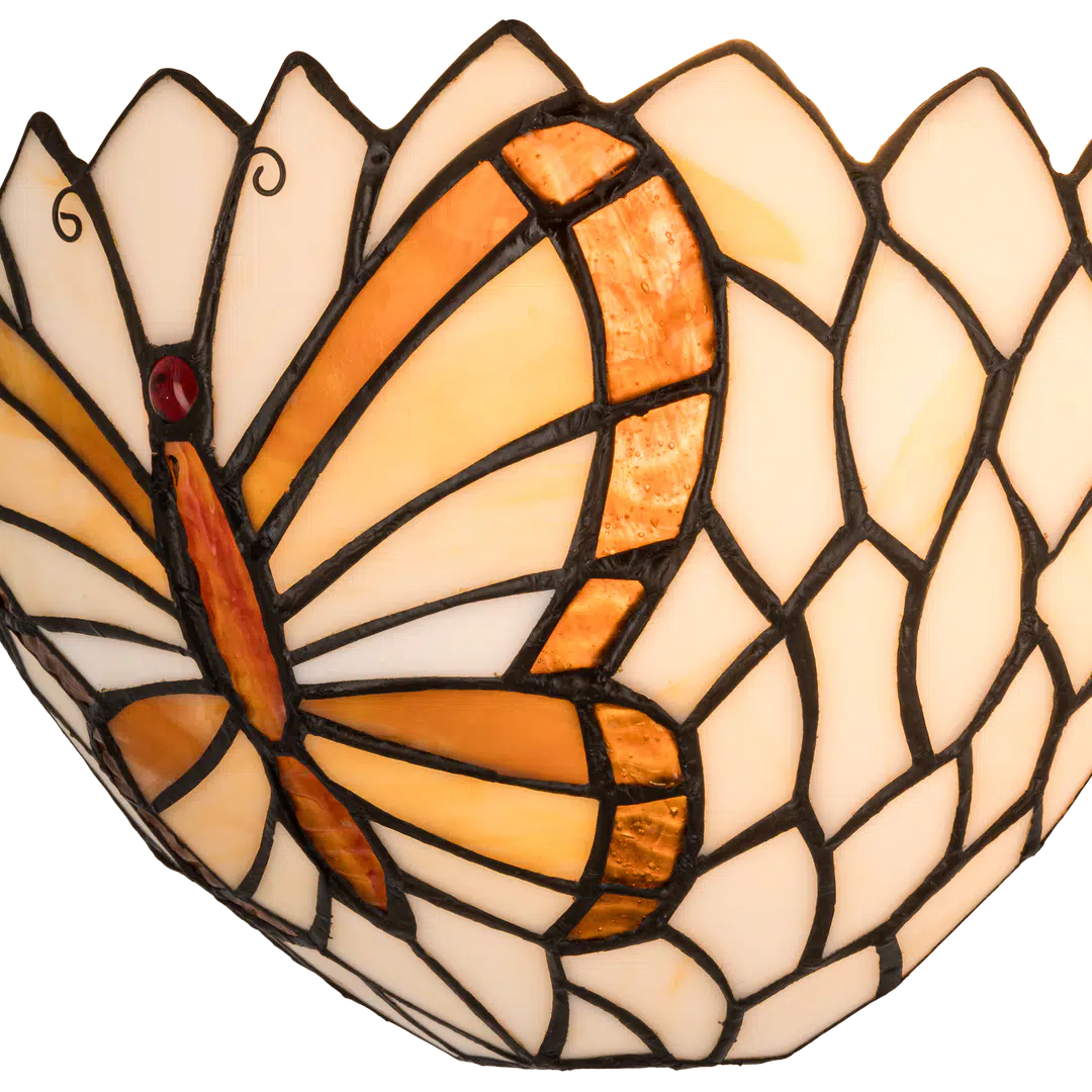Deze wandlamp is volledig handgemaakt, met ongeveer 83 stukjes echt glas die zorgvuldig zijn gesneden en in koperfolie gewikkeld, volgens de traditionele Tiffany techniek. Het vakmanschap van deze lamp is duidelijk zichtbaar in de gedetailleerde vlinder en bloemvormige omlijsting, wat het een uniek en kunstzinnig element maakt in je interieur.