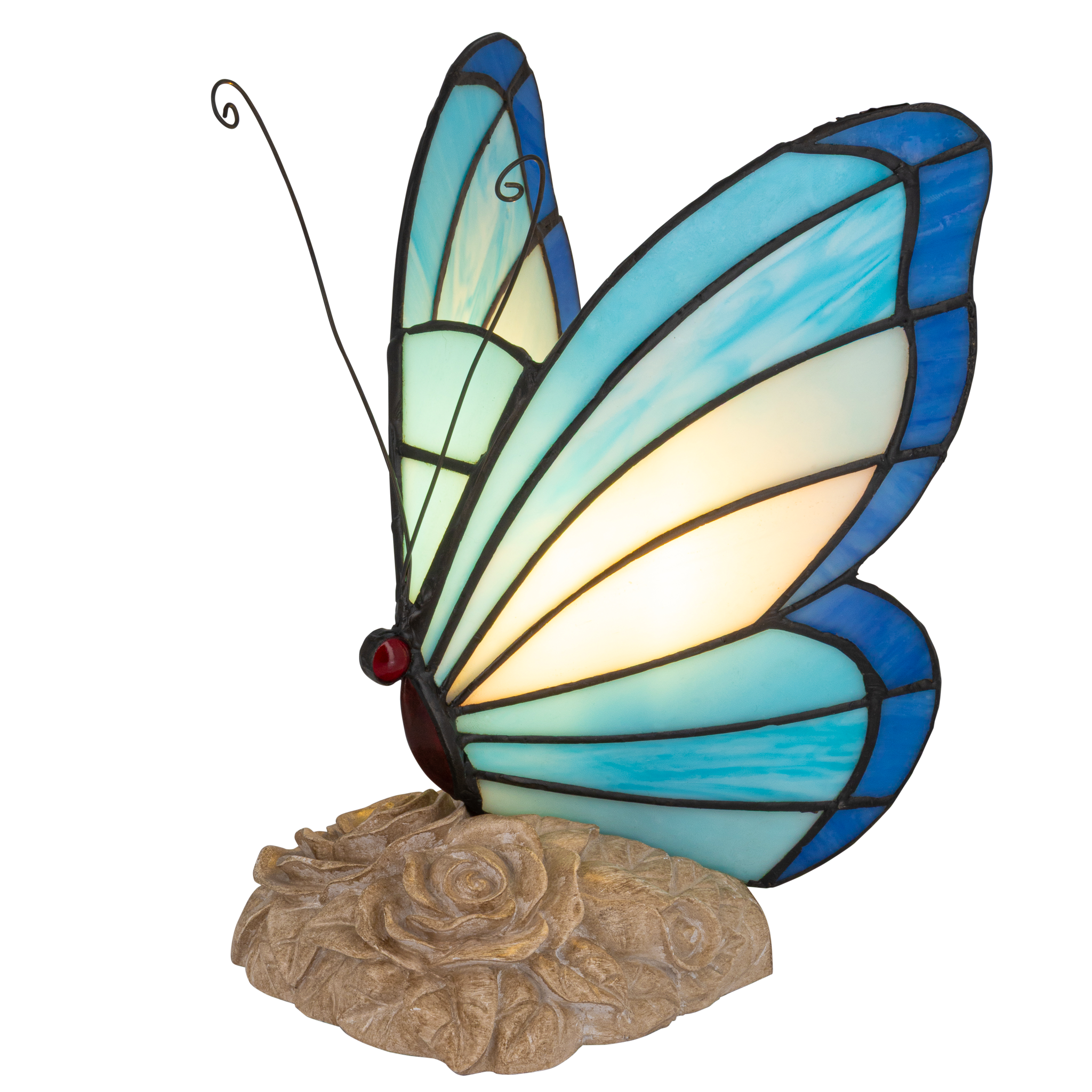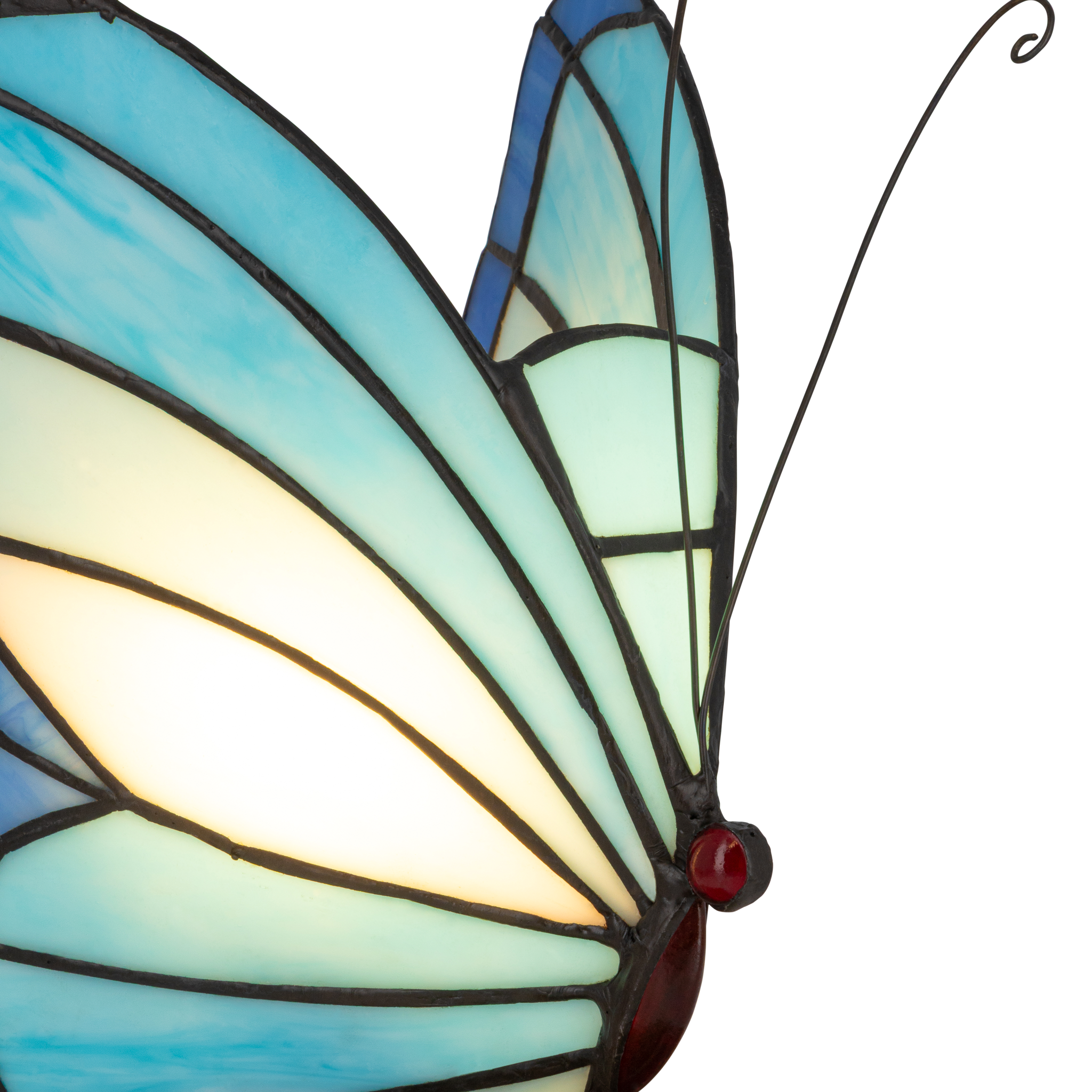 Door de natuurlijke variaties in blauw glas is elke lamp uniek — geen twee vlinders zijn exact hetzelfde.