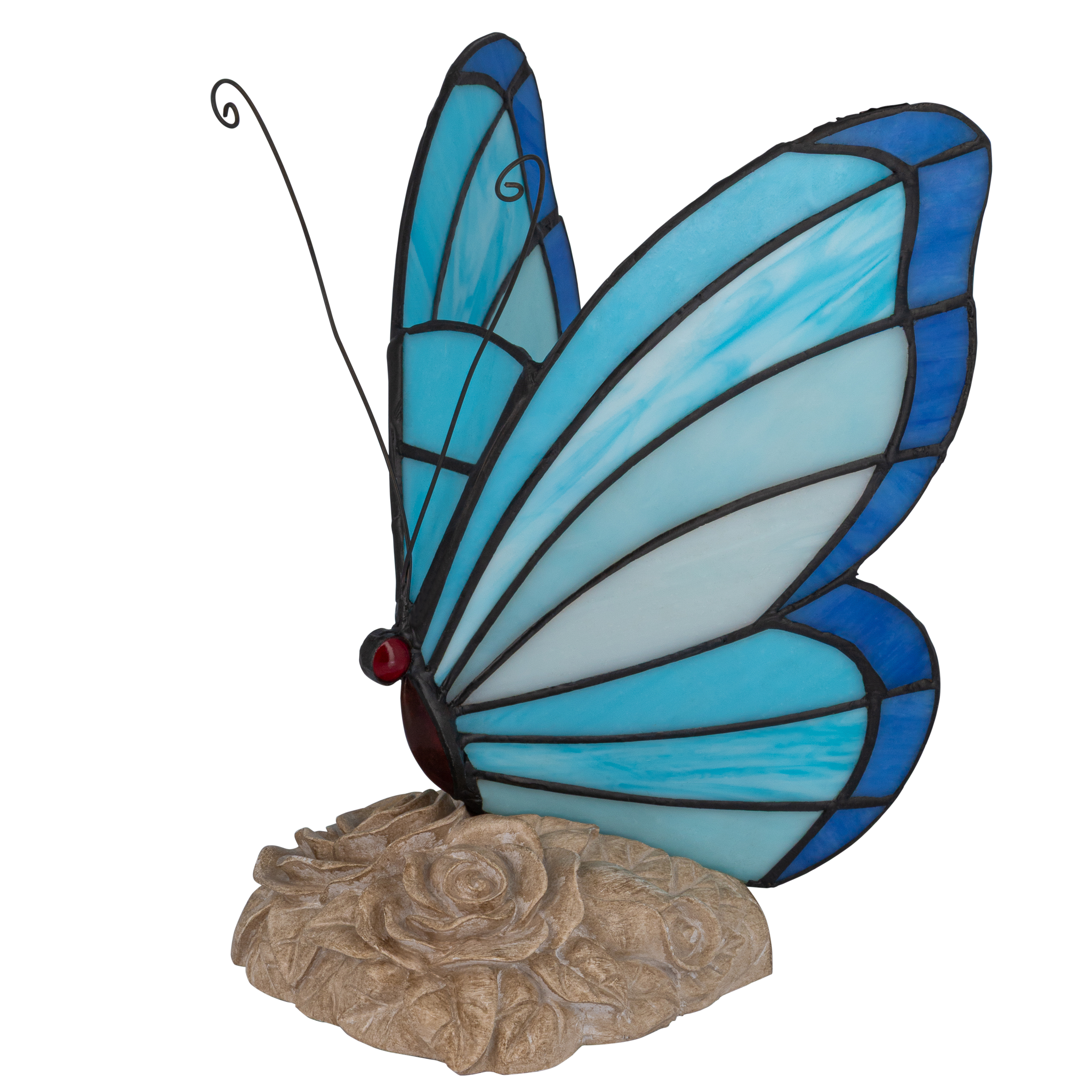 De vlinder staat op een sierlijke voet met gedetailleerde rozenornamenten, wat het geheel een romantische, natuurlijke en verfijnde uitstraling geeft.