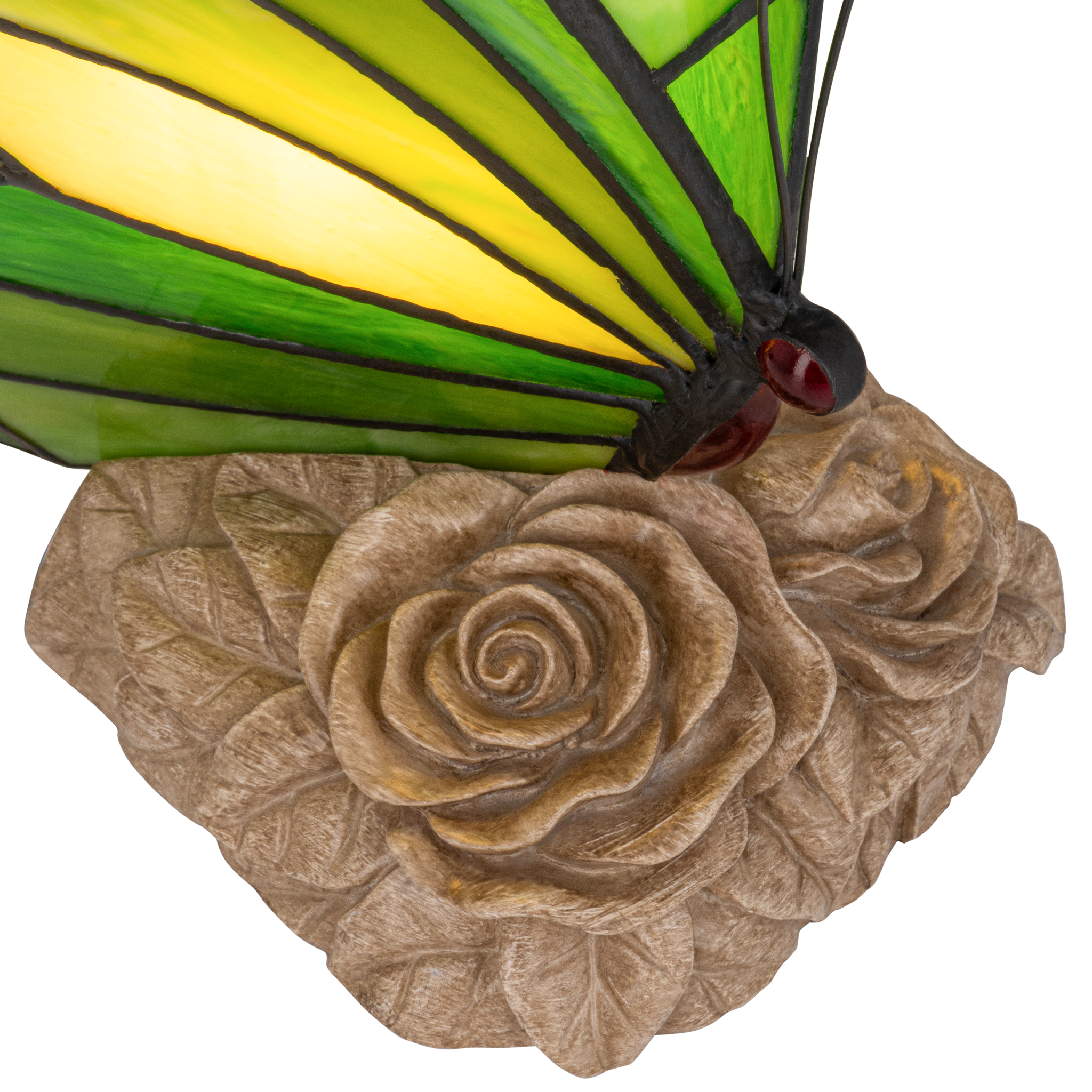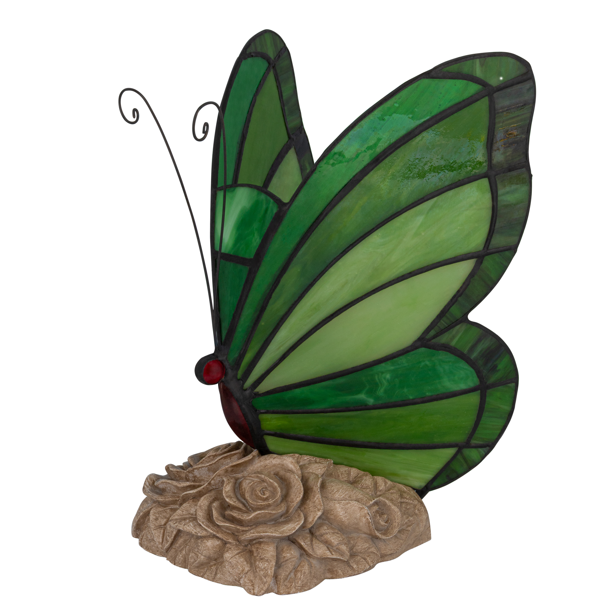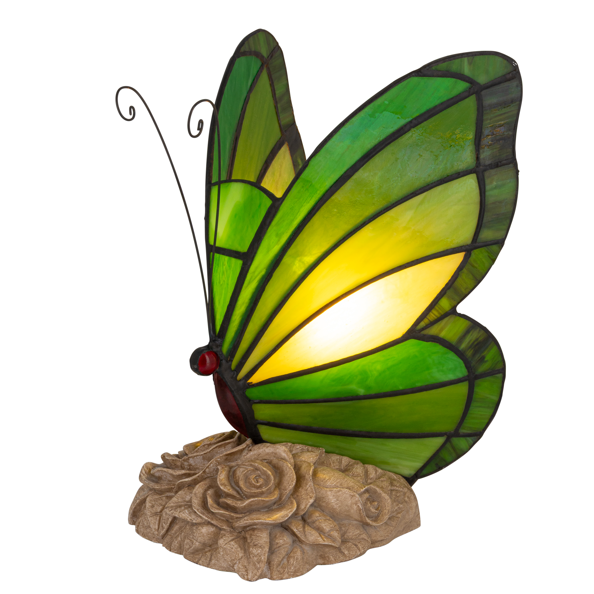 Breng frisse helderheid, warme sfeer en een vleugje romantiek in huis met deze charmante Tiffany vlinderlamp van RORUVERA. De vleugels zijn opgebouwd uit ca. 34 handgesneden glaspaneeltjes, waarbij verschillende groentinten prachtig samenvloeien. Het glas heeft de typische Tiffany-structuur met zachte kleurnuances, waardoor de vlinder zowel levendig als verfijnd oogt.